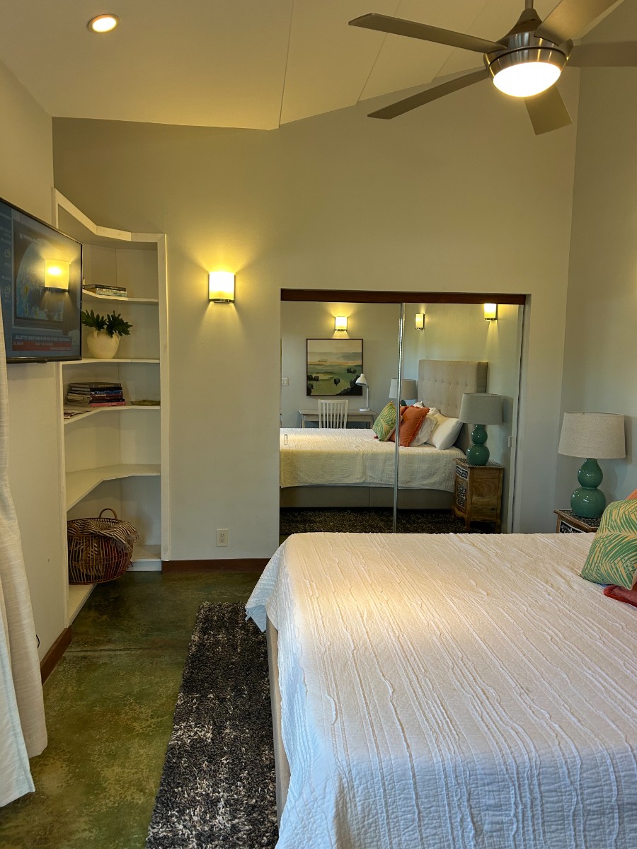 Window AC. Ceiling fan. Louvred teak windows. Concrete floors.