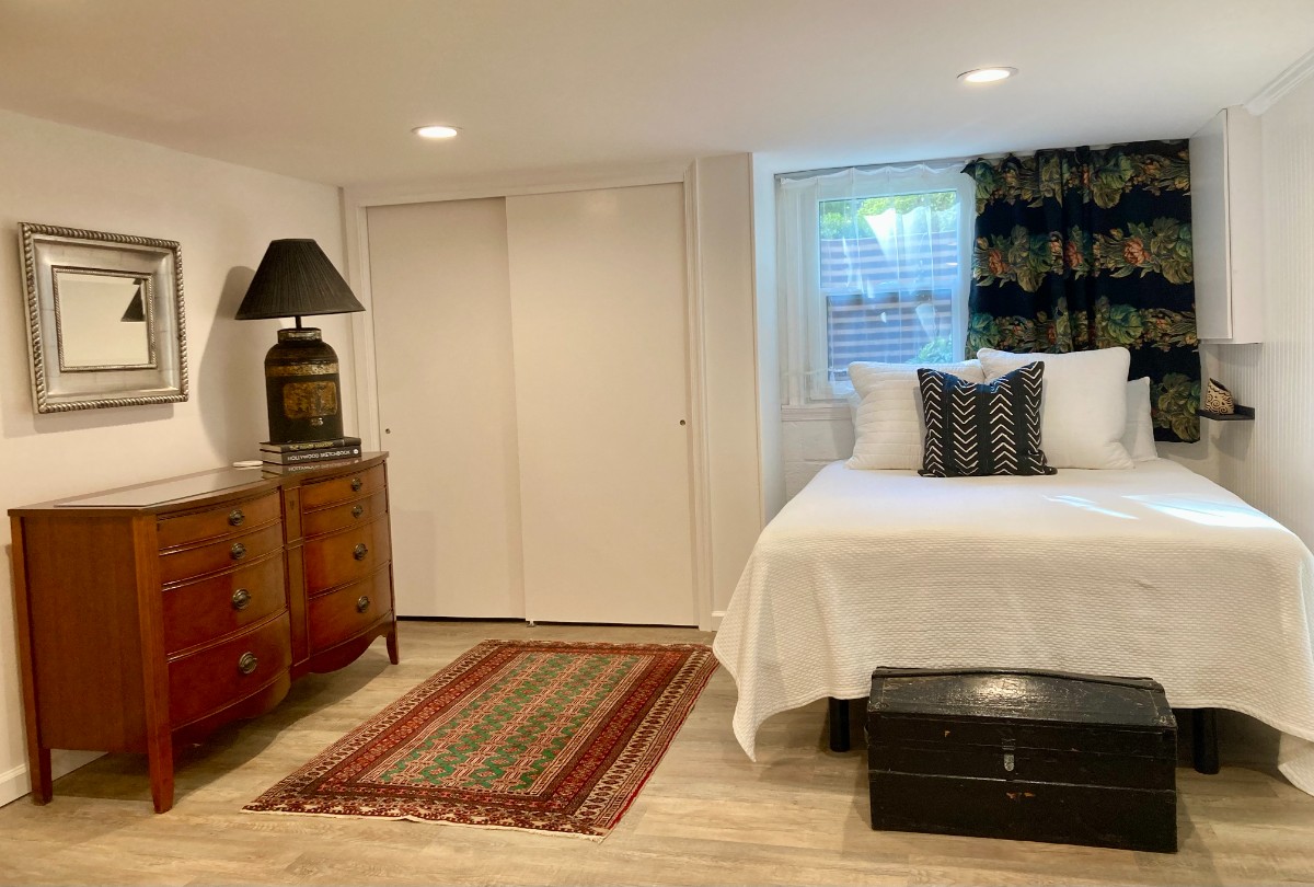 Exclusive, off-street parking leads to the fenced private garden and private entry. The eat-in kitchen has a full-size fridge, countertop oven, microwave, cooktop, and new washer/dryer. In the bedroom, the queen bed is nestled in a sleeping alcove with black-out drapes, and the dresser and full-size closet give ample room for storage. Although there is a work station in the living area, the gallery hall is wide enough to accommodate additional workspace or storage.