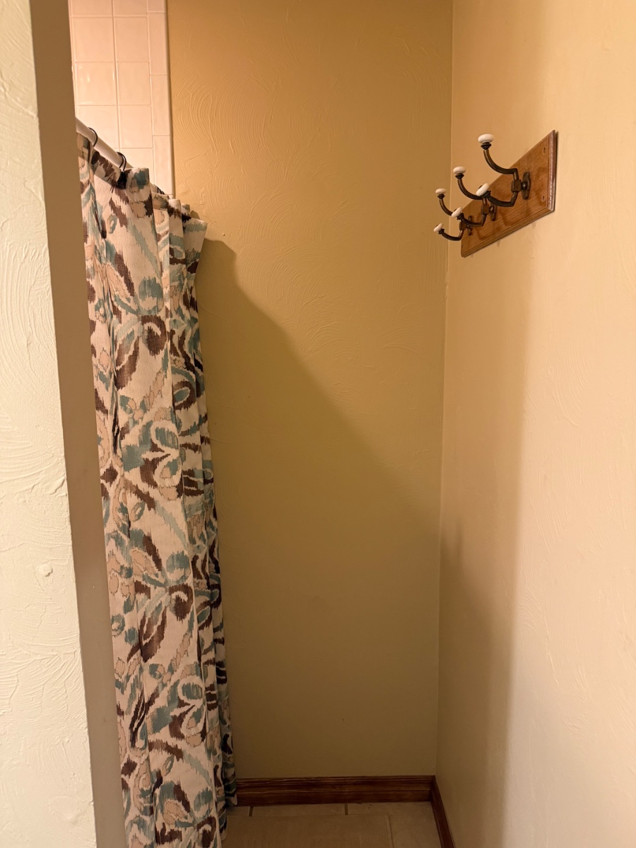 Private Bathroom: Includes a pocket door for space-saving convenience; towels and extra sheets included.