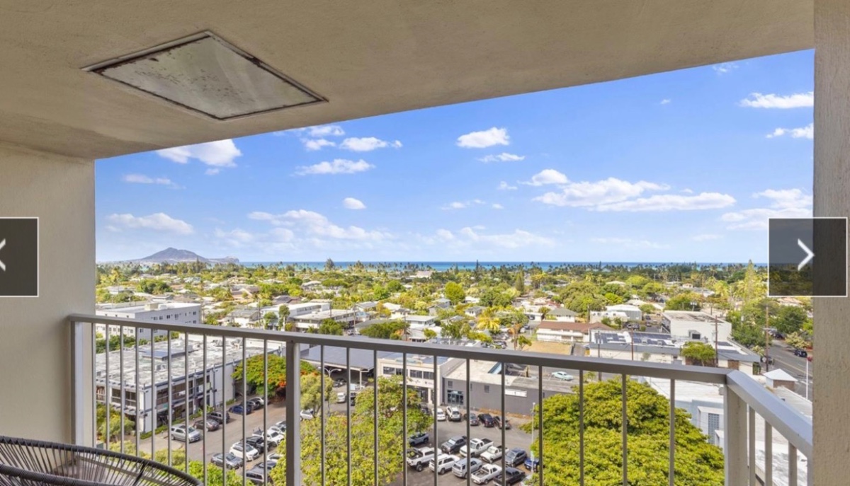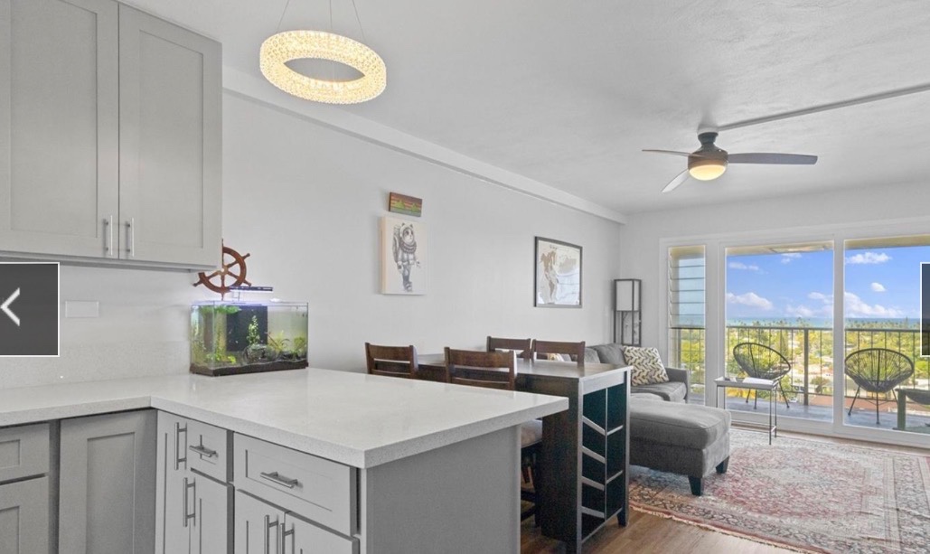 Stunning and updated high-floor unit at Meridian East, offering sweeping views of Kailua Bay. This 2-bedroom newly furnished apartment boasts modern finishes, including quartz countertops, rich hardwood cabinetry, updated appliances, including washer/drter. The open-concept living space extends seamlessly to the lanai, where you can enjoy the sights of Kailua town with 180 degree ocean as your backdrop. New vinyl windows and ceiling fans enhance airflow and natural light. Enjoy relaxing by the pool or take a quick trip to the world-renowned Kailua Beach. Includes one covered parking space in a secure building surrounded by popular shops and dining options.