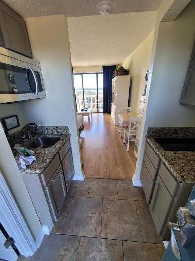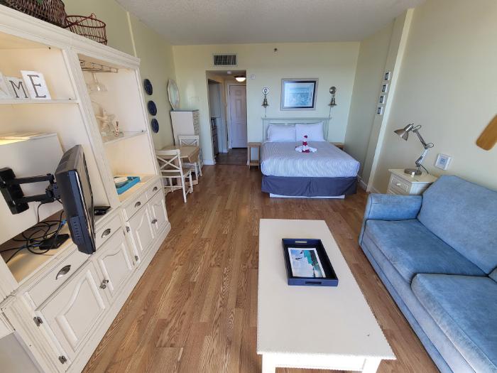 The studio condo's living area (and bedroom for four, thanks to the Queen Sofa Bed and main Queen bed) offers easy access to fresh air on the balcony, as well as plenty of entertainment thanks to the smart TV and wireless internet. Shared coin-operated laundry facilities are also available for your convenience. Whether you dine at the indoor table for two, with the great view of the balcony, or the tables near the community grills, you'll love food prepared in the well-equipped kitchenette, 2 burner cooktop, microwave, complete with a compact refrigerator and granite countertops. The lone bathroom is bright, spacious, and offers a tub/shower combo to get nice and clean before heading out. Free parking. NO PETS or SMOKING ALLOWED!