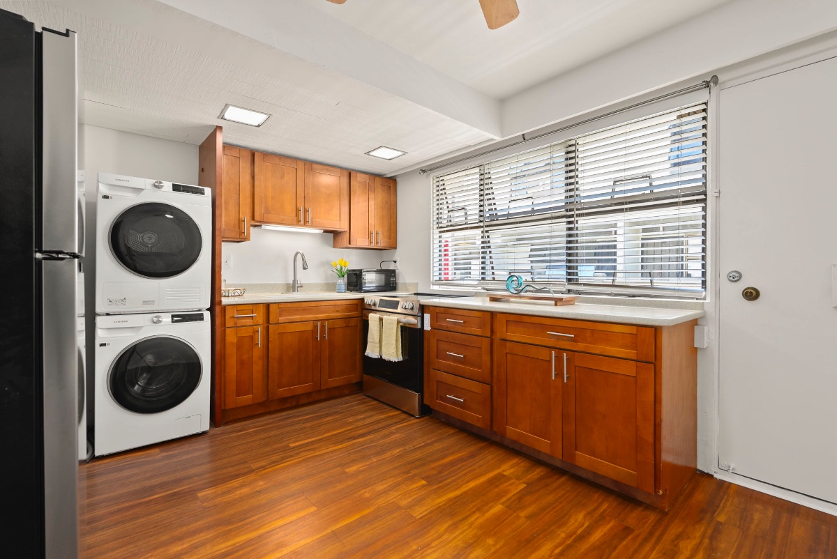 Move-in ready and priced to sell! This beautifully updated 2-bedroom, 1.5-bath townhome with one assigned parking stall is centrally located in the heart of Aiea, just minutes from Pearlridge Center, Pearl Harbor, and with easy access to bus, rail, and freeway connections. Enjoy outdoor living at Blaisdell Park and along the Pearl Harbor bike path, perfect for biking, jogging, or leisurely walks. Inside, you’ll find a bright, open-concept layout filled with natural light and a fresh coat of paint throughout. Recent upgrades include a brand-new electric stove, washer and dryer, ceiling fans, front gate, and carpet on the stairs. Additional improvements feature updated electrical outlets, kitchen cabinets, closet shelving, water heater, and A/C units in both bedrooms for year-round comfort. Conveniently located near shopping, dining, and entertainment, this townhome offers the perfect blend of comfort, convenience, and value. Don’t miss this excellent opportunity in a desirable central Oahu location!