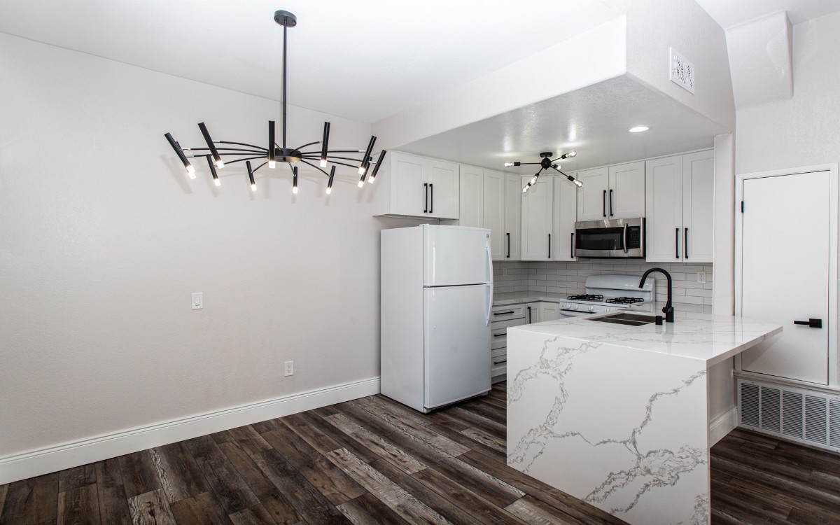 Remodeled upstairs single level 3 Bedroom, 2 bathroom condo. Laminate flooring throughout, open modern floor plan between the kitchen and living room. All appliances included. AC included! Features a cozy gas fireplace. Offers a private patio off of the living room. In unit Washer & Dryer included. Large one-car garage with plenty of room for extra storage. One assigned parking space. Unit is close to complex Olympic size pool, spa, fitness room, steam room, tot lot, tennis court, and putting green. Less than 5 minute's drive to the beach & pier.