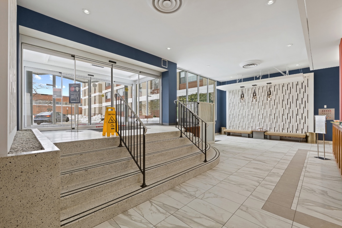 The interior features hardwood floors in the bedrooms, marble flooring in the entry, and a recently refreshed look with fresh paint throughout. The kitchen is finished with granite countertops, and includes a stove and dishwasher less than two years old, along with a washer/dryer combo in the unit. Additional conveniences include laundry rooms on each floor and a 24-hour main-level laundry facility.