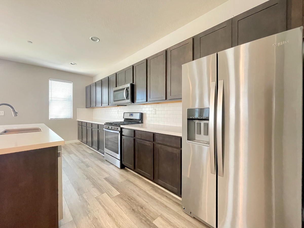 This spectacular 3-bed condo located in Affinity community is ready for immediate move-in! This open-concept home boasts amazing upgrades throughout, quartz countertop, ss appliances, island breakfast bar kitchen with a large walk-in pantry. Primary bed and bath with walk-in closet and double sink. 2 car garage attached. Community pools, spa, and fitness center. This amazing community is in the heart of Summerlin.Water paid by HOA.