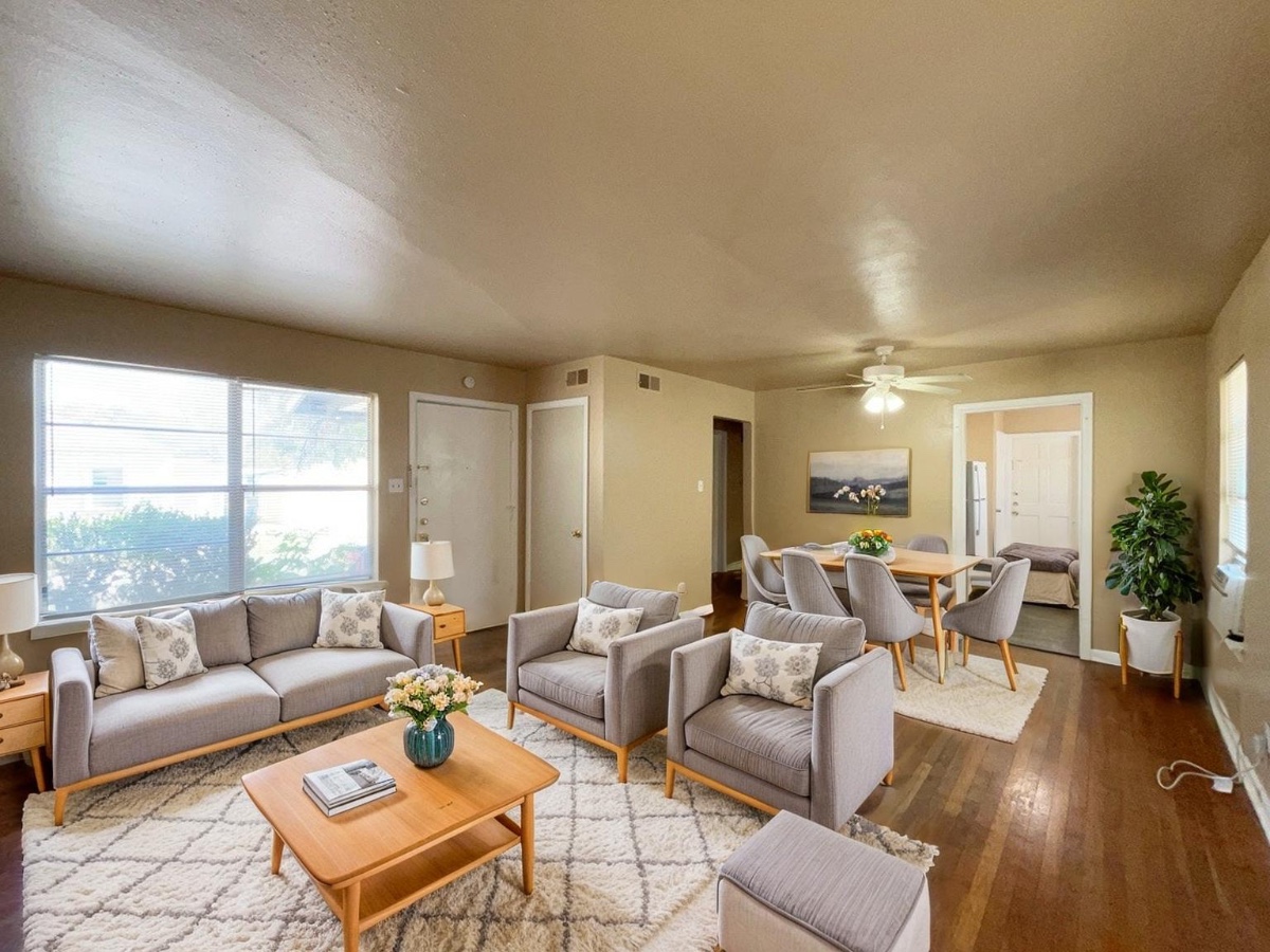 Discover the appeal of this charming 2-bedroom, 1-bathroom home located on a corner lot featuring timeless wood flooring throughout, creating a warm and inviting ambiance.