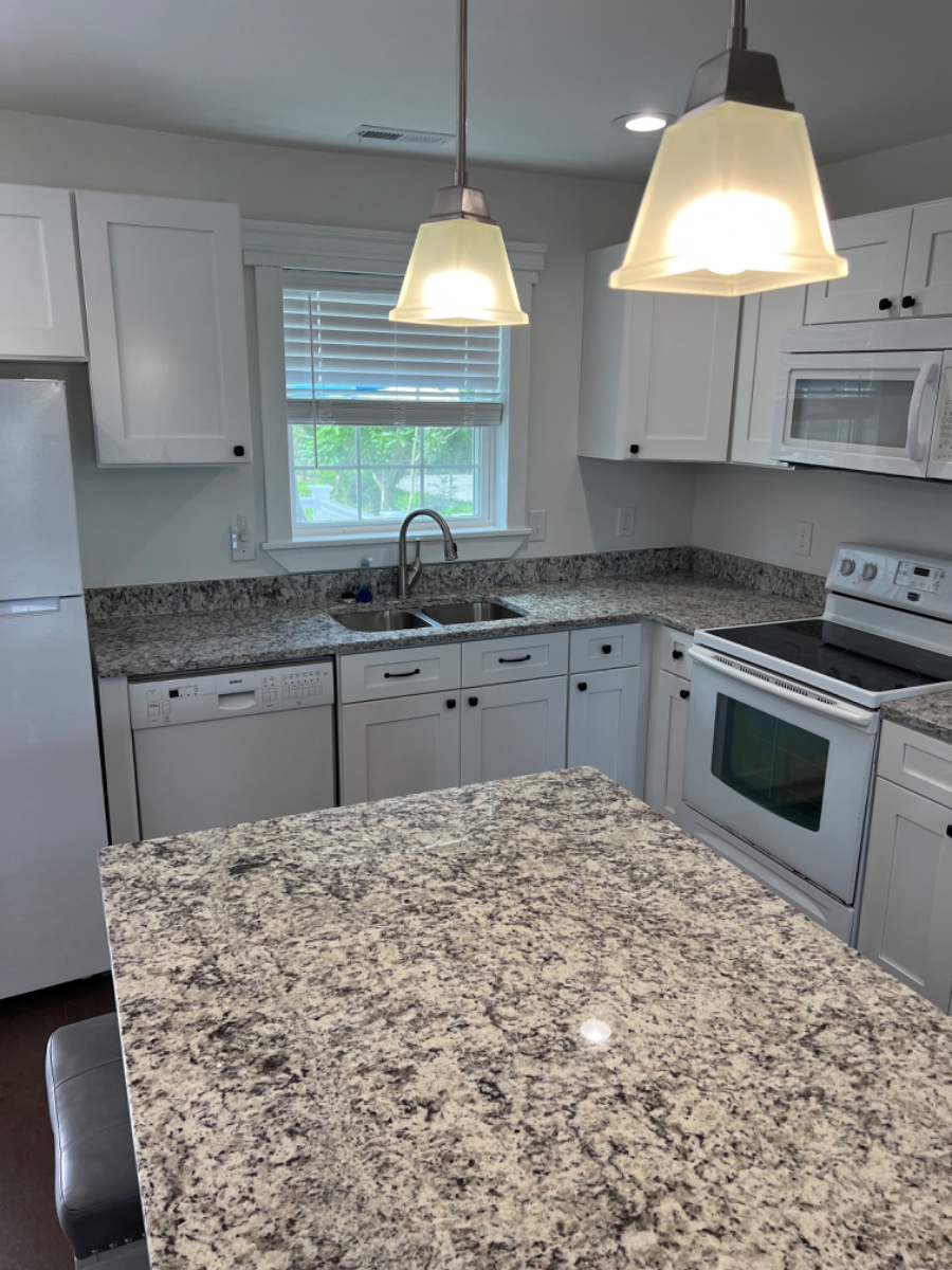 Open concept kitchen to the living room with granite countertops and island.