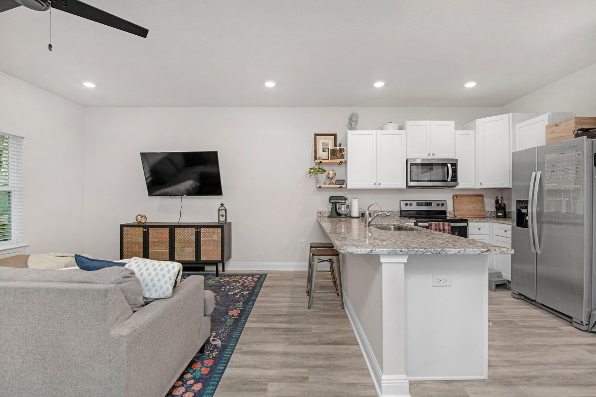 Step into this nearly new coastal-style townhome in the heart of Fort Walton Beach, where convenience meets modern beachside living. Designed with a light, airy aesthetic, this home features crisp white cabinetry, stone countertops, and a fully appointed kitchen with sleek stainless steel appliances. The open-concept living area showcases luxury vinyl plank flooring in a light wood look, complemented by recessed lighting and abundant natural light throughout. Perfect for entertaining, the main level includes a guest half bath and easy access to the back porch, overlooking mature trees for privacy and shade. Upstairs, the primary suite offers plush carpet, a large window, and an en-suite bath with a dual vanity, matching cabinetry and stone countertops, and a glass-enclosed walk-in shower. Two additional bedrooms, a hallway laundry closet, and a guest bath with a bathtub/shower combo and single vanity complete the second level. With its modern finishes, thoughtful layout, and prime location near the beach, shopping, and dining, this townhome combines style and convenience—ideal for both everyday living and weekend getaways! Contact us today for your showing! 448-777-4966