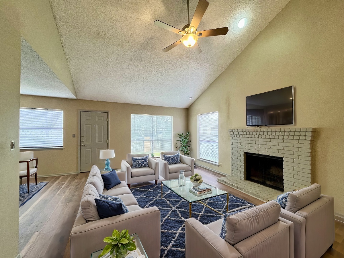 The living room is perfect for entertaining, with a cozy fireplace and plenty of room to relax. Additional highlights include central air conditioning, programmable thermostat, ceiling fans, and double-pane windows for year-round comfort.