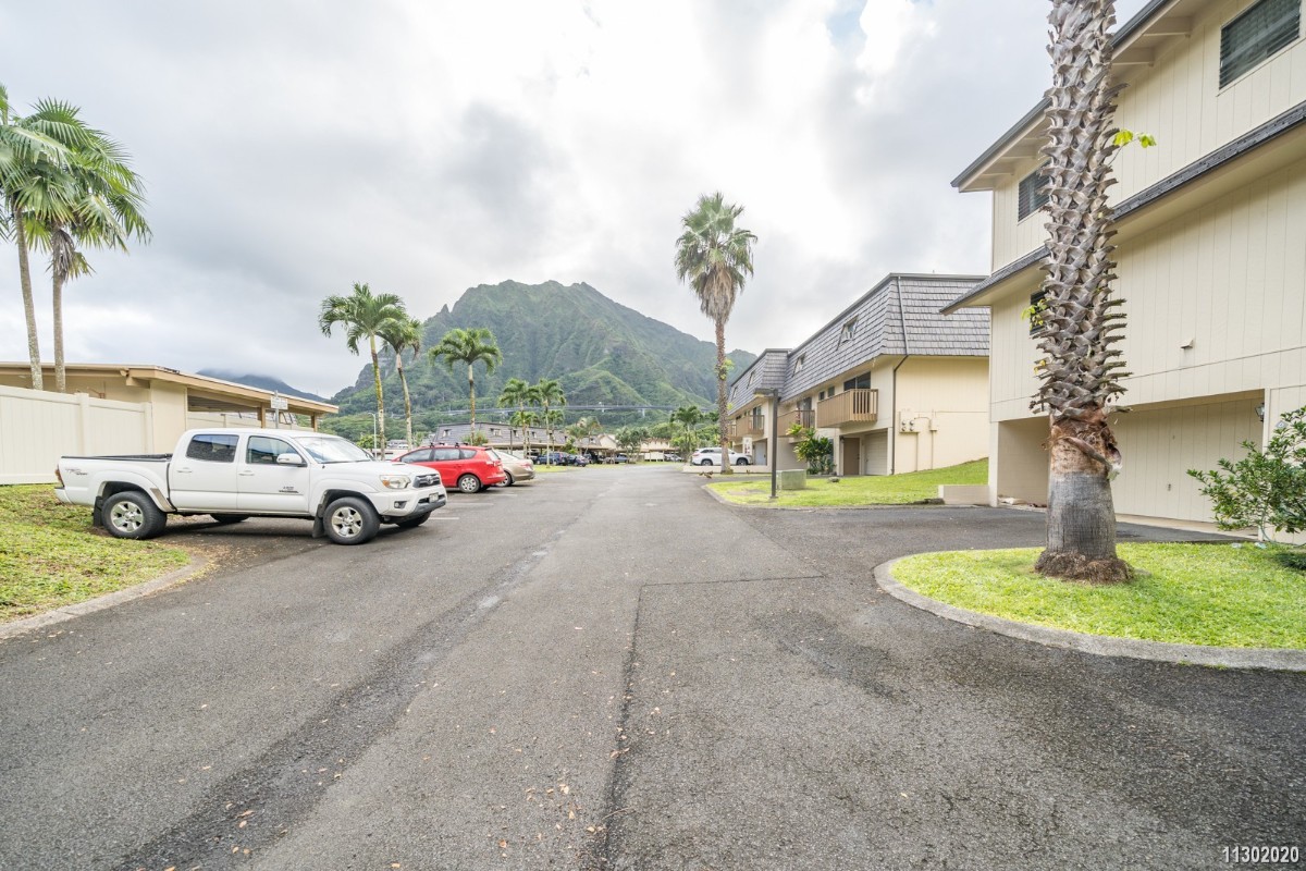 This 1344 sq ft 3 bedroom 2.5 bath townhome sits in a quiet neighborhood along the Koolau mountain range. The recently renovated interior features split AC on main floor, window AC for each bedroom, and master bedroom walk-in closet. Modern open concept kitchen has granite countertops, new vinyl plank flooring, breakfast bar, and stainless appliances. Front-load washer/dryer are tucked off kitchen for convenience. Sit out on the private 384 sq ft back patio off the living room with private gate access to Haiku Rd. The private two-car garage has two tandem parking in the driveway. Multiple guest parking stalls throughout development and lots of street parking.