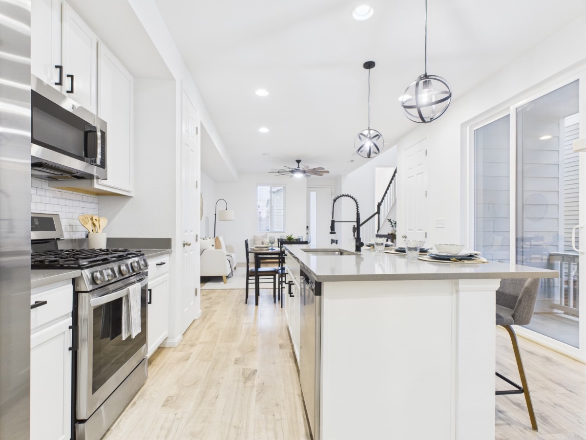 The spacious main floor features upgraded LVP flooring and 8-foot doors throughout, creating an open, airy feel. The kitchen is a chef’s dream with a larger island, quartz countertops, pendant lighting, updated faucet, and a stove with a fifth burner plus convection and air fryer options. The open stair railing and farmhouse-style ceiling fans with remotes add both elegance and convenience. The remodeled powder bathroom on the main floor features a modern vanity with updated fixtures and black hardware for a sleek, contemporary look.