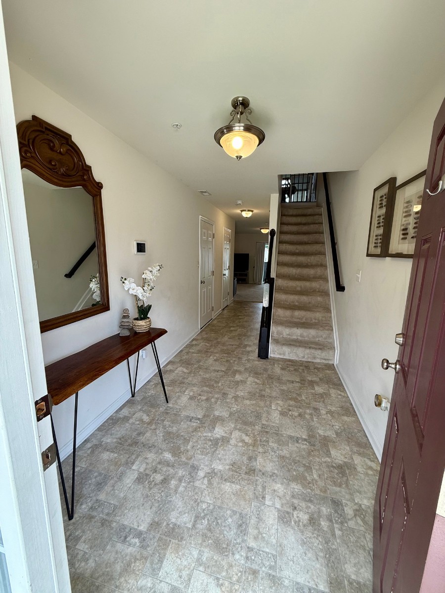This gorgeous 2,116 sq ft interior row townhouse is located in the very sought after Prince Frederick Crossing neighborhood. The home is located just a short distance from shopping, restaurants, several county parks, Prince Frederick Hospital, PAX River Naval Station, Andrews Air Force Base, Annapolis, and Washington D.C. The neighborhood includes a club house, playground with basketball court and sidewalks throughout. The front of the home includes 1 driveway parking space, 1 car garage and 1 assigned parking space within a short walk from the house, totaling 3 parking spots for this address. Step inside this well-maintained home offering multiple spacious living options. The ground level floor features a large entry/foyer just inside the front door with a large coat closet, half bathroom, and access to the 1 car attached garage. Towards the back of the home on the ground level is a spacious living area with access to the private, fenced-in backyard and concrete patio. Up the stairs you find an open concept floor plan with a large kitchen, dining/living room combination, a half bathroom, reach-in kitchen pantry, and 9-foot ceilings to make the area feel roomy. This incredibly spacious area has a large kitchen featuring a granite counter with breakfast bar, stainless steel appliances and an area for a kitchen table. The living/dining room combination is perfect for entertaining family and friends along with a built-in electric fireplace to enjoy during the cold winter days. The 2nd and 3rd bedrooms are located on the 3rd level with a full bath, laundry room, and a large linen closet. Each of these bedrooms on the 3rd floor are expansive with large walk-in closets for amble storage. The 4th level of this home features a magnificent master suite with a private bathroom, large walk-in closet, sitting area, an additional storage room, and vaulted ceiling. The large 4-piece bathroom has 2 separate sink vanities with storage, a corner soaking tub, large standup shower, and a separate toilet room. All rooms have wall to wall carpet with linoleum flooring in the kitchen, entry/foyer areas, and bathrooms. Off the living room is a generous sized composite material deck perfect for grilling and outdoor entertaining. This home offers many incredible features, tons of storage options, and multiple living areas for spacious living.