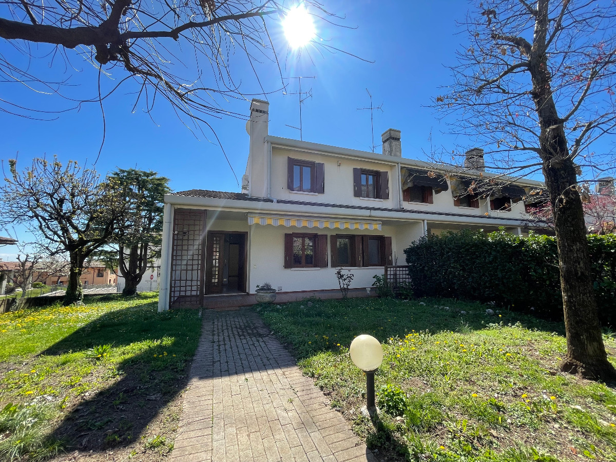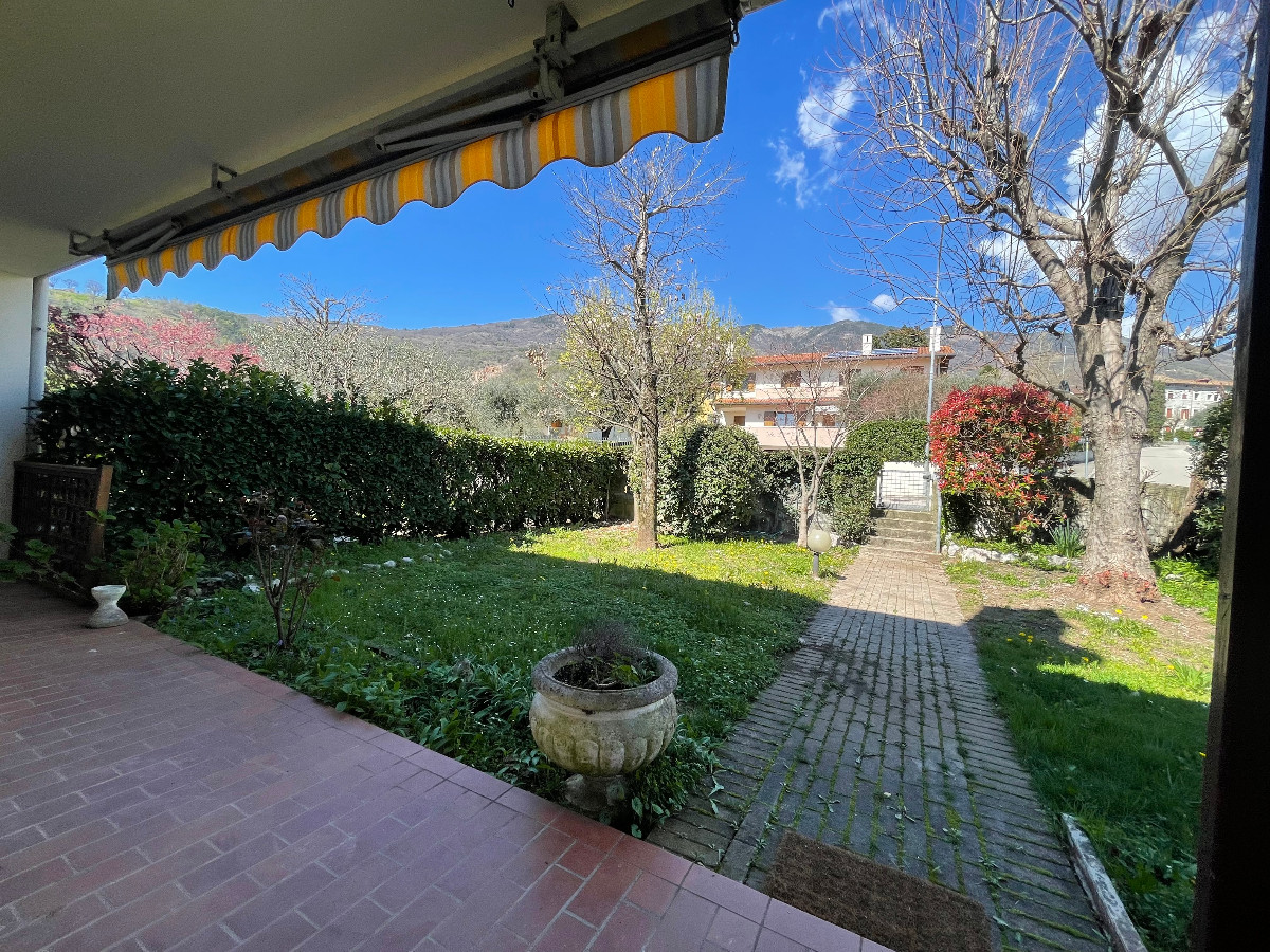 main floor: entryway, fully furnished kitchen, spacious living room with fireplace, dining room that opens to a nice covered balcony with beautiful view, one small guest bathroom; top floor: three bedrooms, one bathroom, small balcony; basement: nice typical "taverna" family room with fireplace, two cars garage, third bathroom, storage room; City gas heating, energy efficiency "E".
