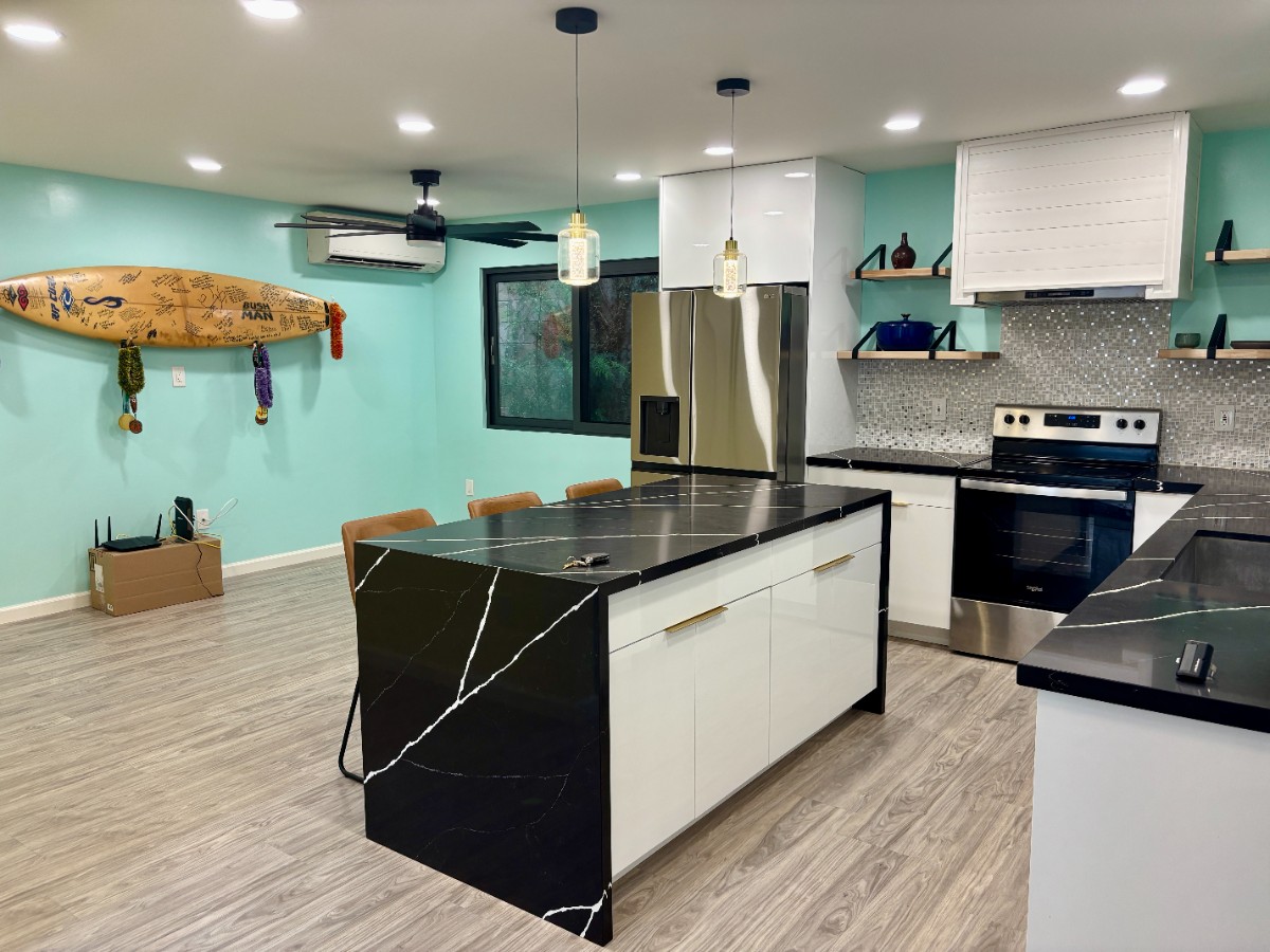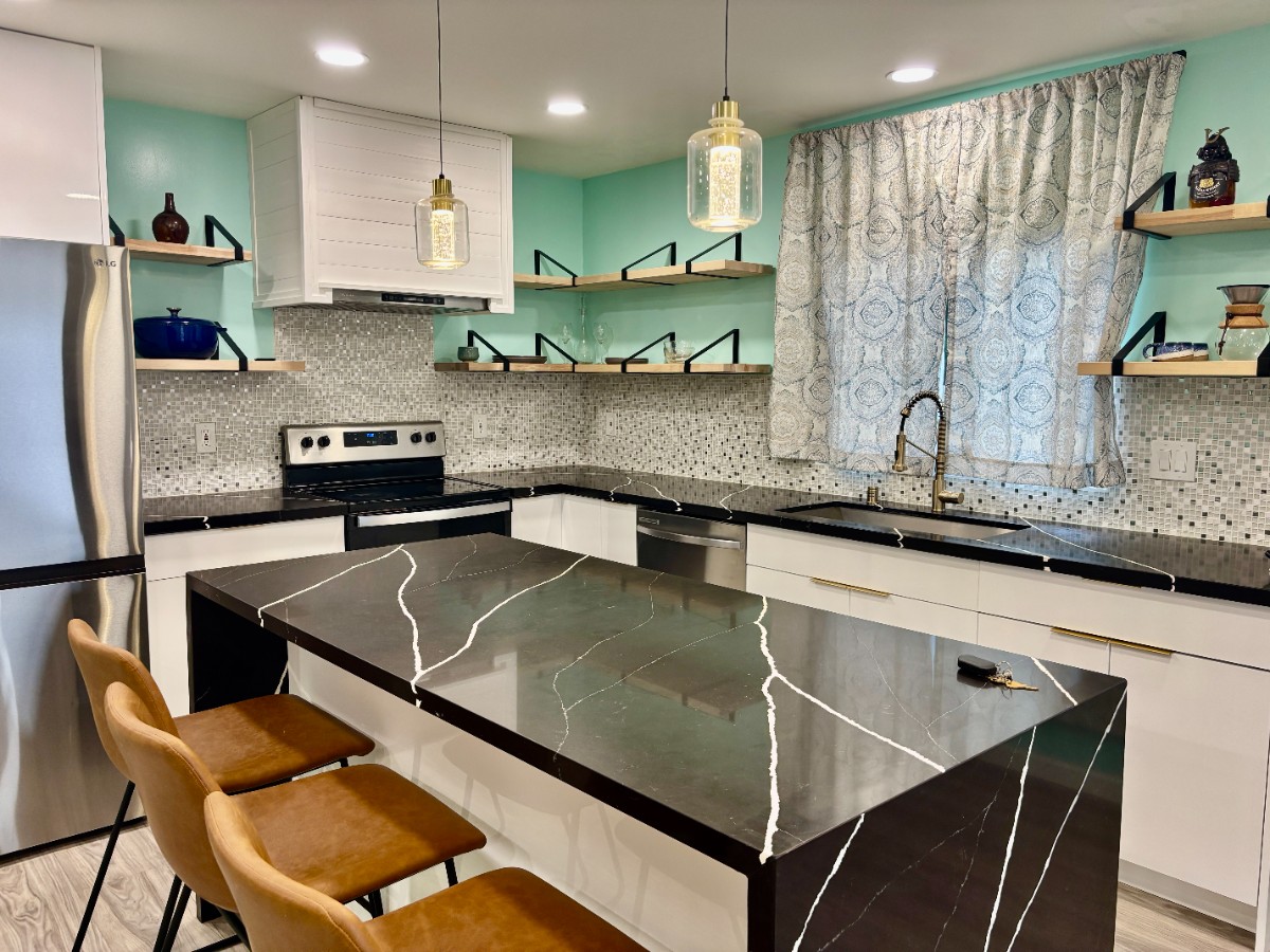 The home boasts a stunning kitchen with stainless steel appliances and a marble-topped island, a convenient first-floor bedroom with full bath, and an efficient solar water heater.