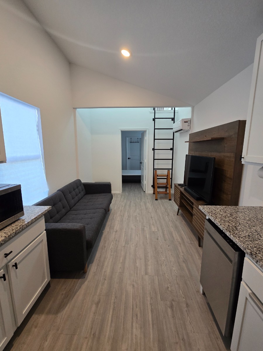 A fully furnished tiny home style dwelling that has all the things ready to go for anyone new to the area or just starting out. Located outside of the busyness of the city, but close enough to any of the bases for a reasonable commute. The tall ceilings and open floor plan make the space feel much larger than it actually is. The kitchen has a full size refrigerator, air fryer + microwave combo, gas stove and oven, a dishwasher, and a full set of dishes and utensils. The living room is equipped with a couch, side table, coffee table, TV, and entertainment center. The Bedroom has a memory foam mattress, 2 built in closets, and 2 sets of drawers. The bathroom is fitted with extra storage over the toilet and a washer and dryer. Up stairs has a dedicated window unit for AC and a full desk and chair. The backyard is surprisingly spacious and has lots of shade from the trees, perfect for get togethers or outdoor hobbies.