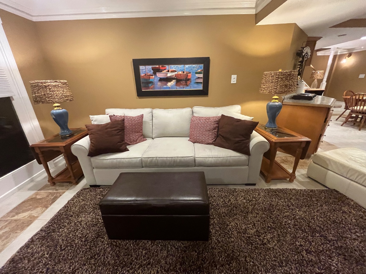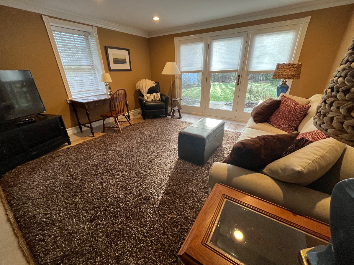 Comfortable living room. There are large floor to ceiling windows, allowing for plenty of light looking out onto a lovely large backyard with adjoining wooded area.