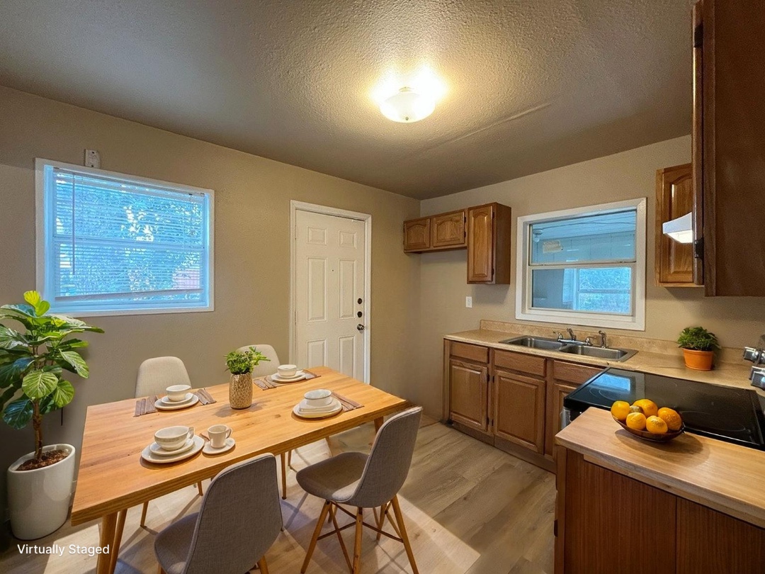 The eat-in kitchen offers a cozy spot for meals and comes equipped with an electric stove and plenty of space to make cooking enjoyable. A separate laundry room with washer and dryer hookups adds everyday convenience. Both bedrooms provide comfortable retreats, with the primary featuring a closet, ceiling fan and its own window unit for customized comfort.