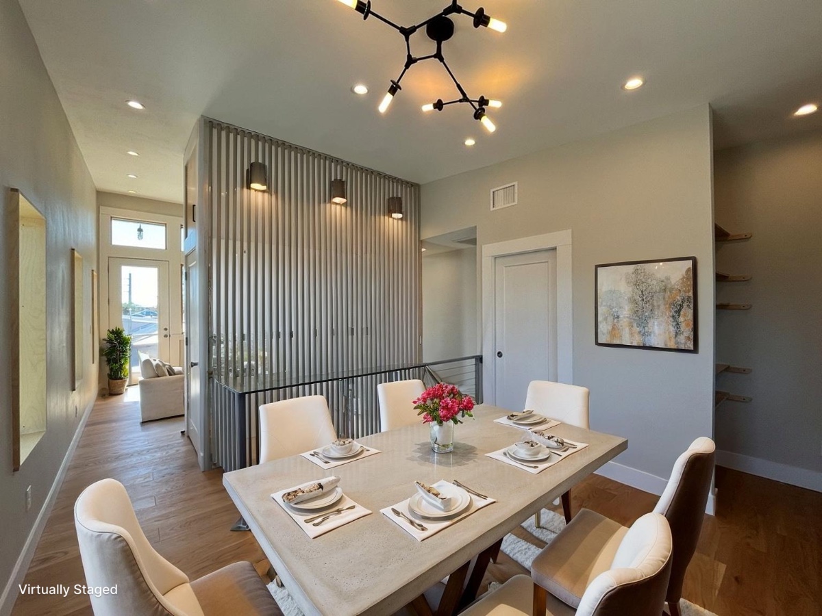 Welcome to this stylish 2-bedroom, 1.5-bath home offering comfort, functionality, and a great city-connected lifestyle. The upper level features an open living area with a well-appointed kitchen and living room, complemented by ceramic tile, stained concrete, and vinyl flooring throughout. The kitchen is equipped with solid countertops, an eat-in dining space, electric stove, microwave, refrigerator, and dishwasher, perfect for both everyday living and entertaining. Upstairs, enjoy a convenient half bath and step out onto the balcony to take in city views from this desirable corner location.