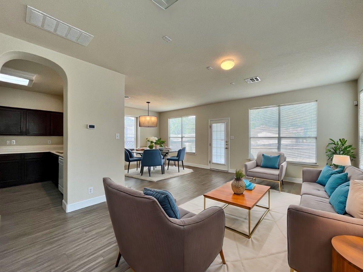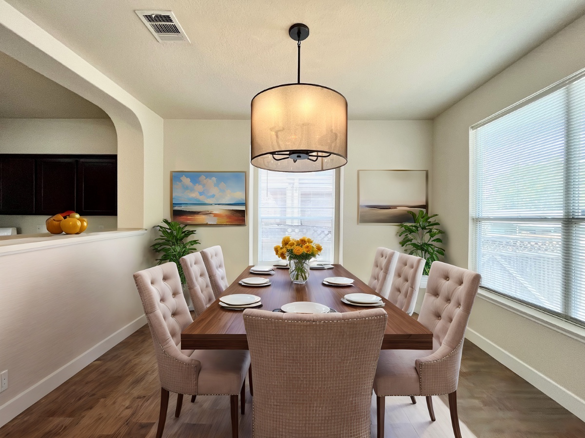 This beautiful 2-bedroom, 2.5-bath townhome offers modern amenities and a convenient layout, perfect for comfortable living. Located in a gated community, this home features high ceilings, vinyl flooring throughout, and a combination living and dining room space. The kitchen is equipped with a breakfast bar, electric stove/range with a glass cooktop, dishwasher, disposal, microwave, pantry, and ice maker connection, making it perfect for both cooking and entertaining.