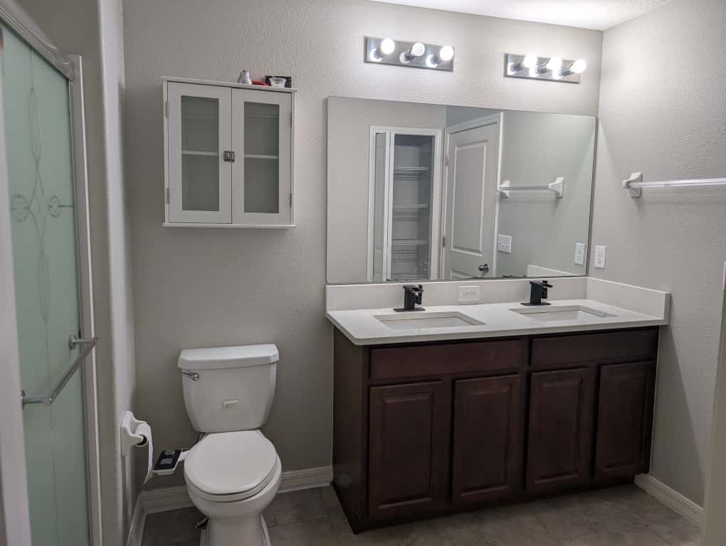 The kitchen is a chef's delight, showcasing upgraded quartz countertops on the kitchen island and in the bathrooms.