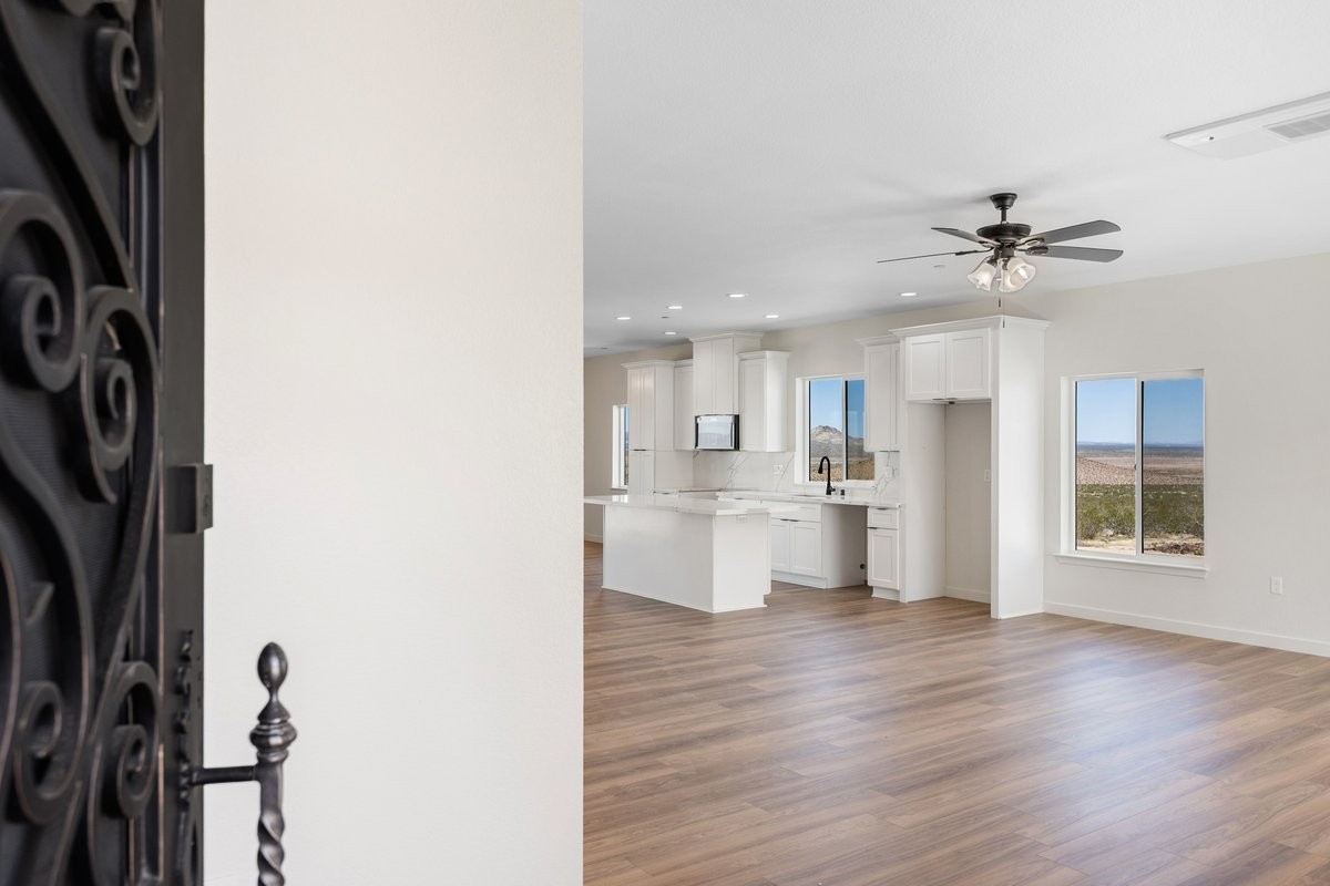 Your dream home awaits, offering Breathtaking Views of California City!* Newly Built in 2025, Custom Construction located in the Rancho Estates on 2.5 Acres, in California City Features 1977 sq. ft., 3 Bedrooms & 2 Baths. As you arrive at your elegant wrought iron front door, you're welcomed by a grand entry showcasing a stunning full decorative stone wall, adding timeless charm and sophistication to the space. Open Floor Plan boasts a grand entry into the main Living area, elegant open Kitchen with Quartz counter tops, tons of self-closing Cabinetry, Black Stainless Steel Appliances, and Large Island. Features include, recessed lighting, custom floor, ceiling fans, highlighted living area featuring 9' ceiling and indoor laundry room. Huge Master Suite and large walk in closet. The master bath is spacious, featuring an oversized walk-in tiled surround shower, dual sinks, and ample cabinetry. Hall full bath is complete with Quartz countertops, tile flooring & tile surround tub/shower. Energy Efficient home with R-60 insulation in ceilings and R21 in walls. Two- 21.5 seer HVAC Systems and solar. This beautifully located home sits in the heart of California City, just minutes from Highway 58 and Edwards Air Force Base!