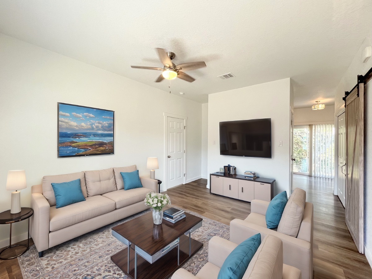The living space is enhanced double-pane windows that invite natural light, while energy-efficient features like air conditioning, ceiling fans, and a programmable thermostat ensure year-round comfort. The primary bedroom offers a luxurious walk-in closet and an ensuite primary bath, providing a private retreat.