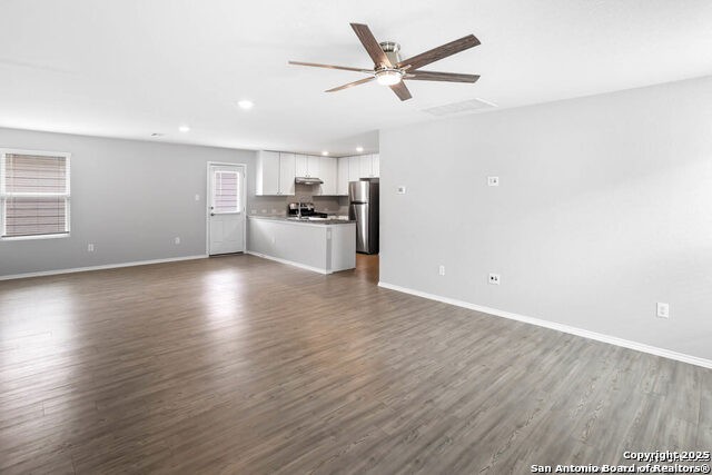 This gorgeous one-story home in the Silos offers 3 bedrooms and 2 baths with a bright, open floor plan designed for modern living. Featuring durable LVP flooring in the main areas, the home flows seamlessly into a stylish kitchen with granite countertops, stainless steel appliances, gas cooking, and plenty of cabinet space. Natural light fills the home, complemented by blinds throughout for added comfort. The spacious master suite includes a walk-in closet and private bath, while the additional bedrooms are well-sized for family or guests. Refrigerator, washer, dryer, and water softener all convey, making this home truly move-in ready. Outside, enjoy a family-friendly community with resort-style amenities including a pool, fitness center, playground, recreation center, and park. Located within Medina Valley ISD with an elementary school right in the neighborhood, and just minutes from major expressways, Lackland Air Force Base, Boeing, and Microsoft, this home offers the perfect balance of convenience, comfort, and community living.