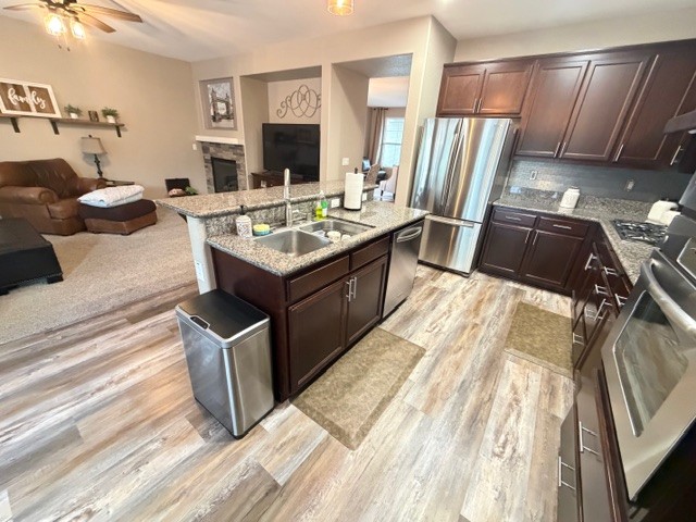 Center island with eat up counter. Living room dining room combo and eat in kitchen. Family room with gas fireplace.