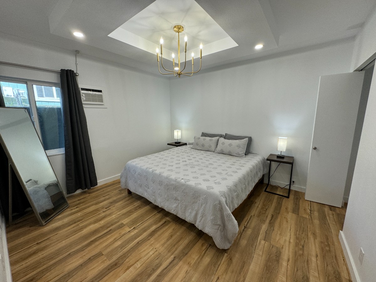 The kitchenette includes a stocked kitchen, a new refrigerator, several small cooking appliances and stackable washer/dryer.