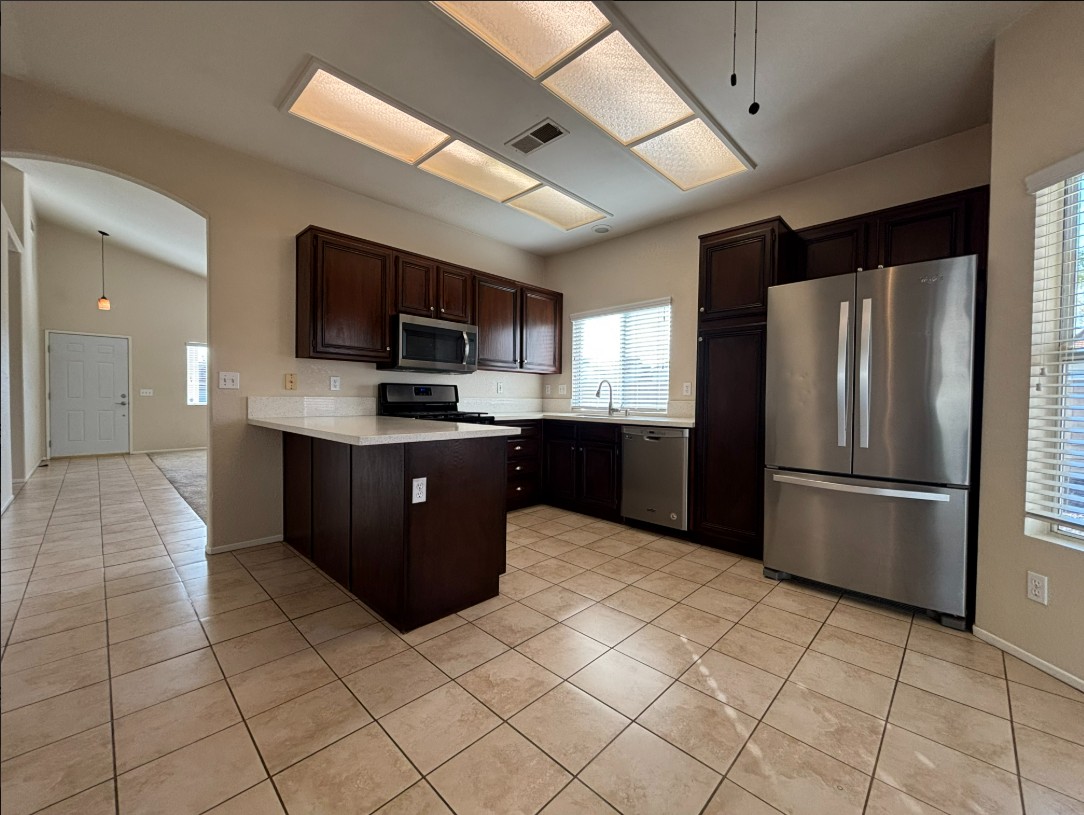 The kitchen features a 5-burner stainless steel stove, stainless microwave, dishwasher, double-door refrigerator, and sleek quartz countertops. The primary suite includes a tiled walk-in shower, refreshed cabinetry, and a spacious walk-in closet. Additional features include ceiling fans and hard-surface flooring for easy care.