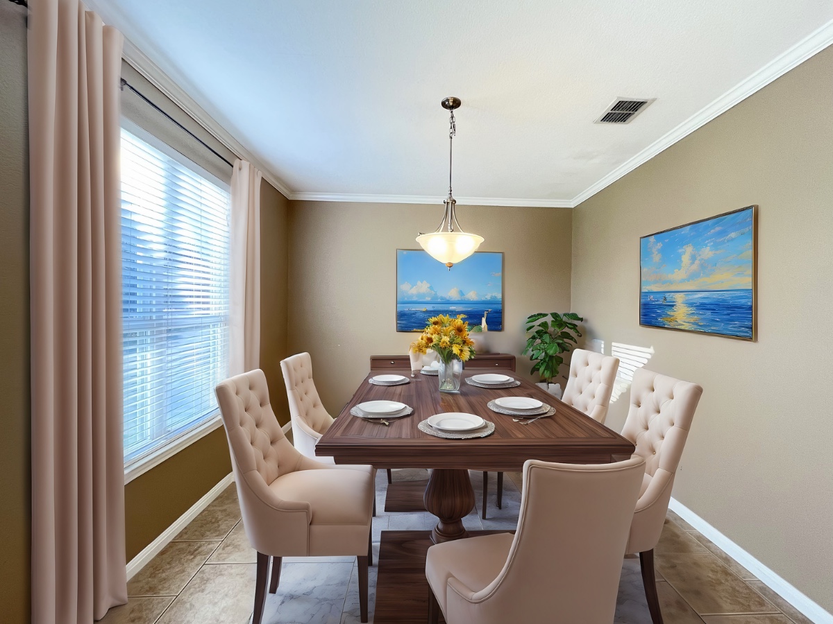 The primary suite includes a walk-in closet and a luxurious primary bath with a double vanity, garden tub, and a walk-in shower. A cozy study/office space allows for versatile living arrangements. The home features modern amenities such as air conditioning, a programmable thermostat, ceiling fans, and blinds throughout. The living room, dining room, and laundry room complete the well-appointed interior, while the 2-car garage offers convenience with an automatic garage door opener and plenty of storage.