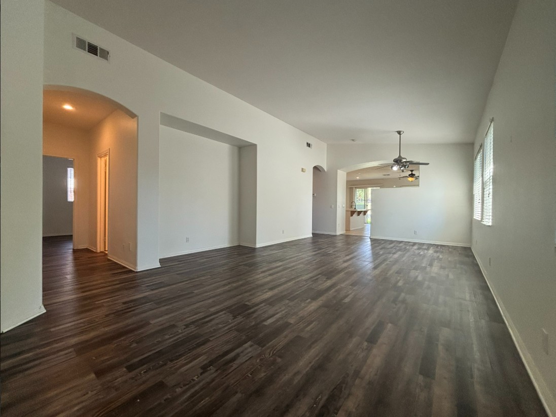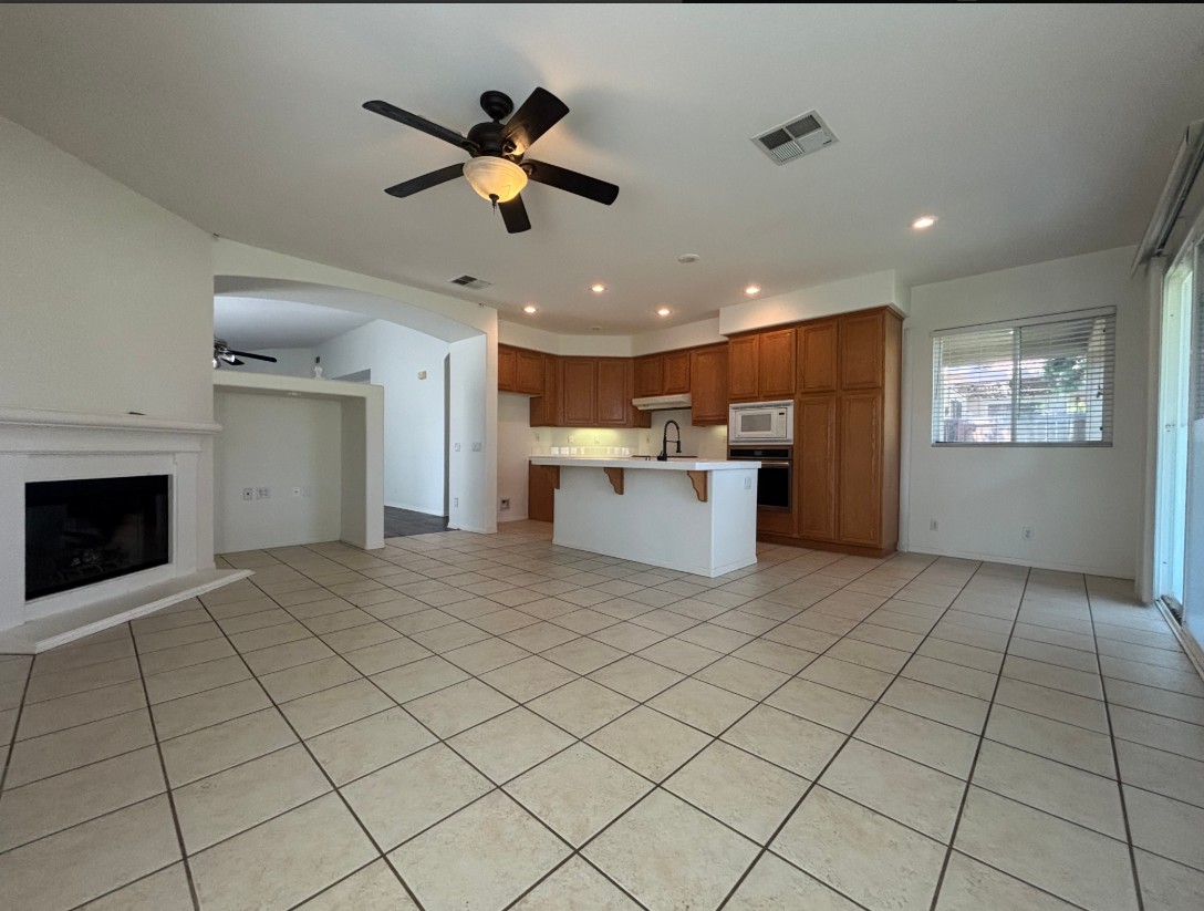 Enjoy both formal and casual living spaces with a roomy front living room and a large family room at the back of the home, complete with vaulted ceilings, a cozy fireplace, and open connection to the dining area and well-appointed kitchen. The kitchen offers a center island, pantry, and abundant counter and storage space. Front yard is in process of being restored to a clean, well-maintained condition.