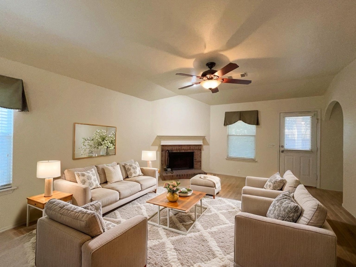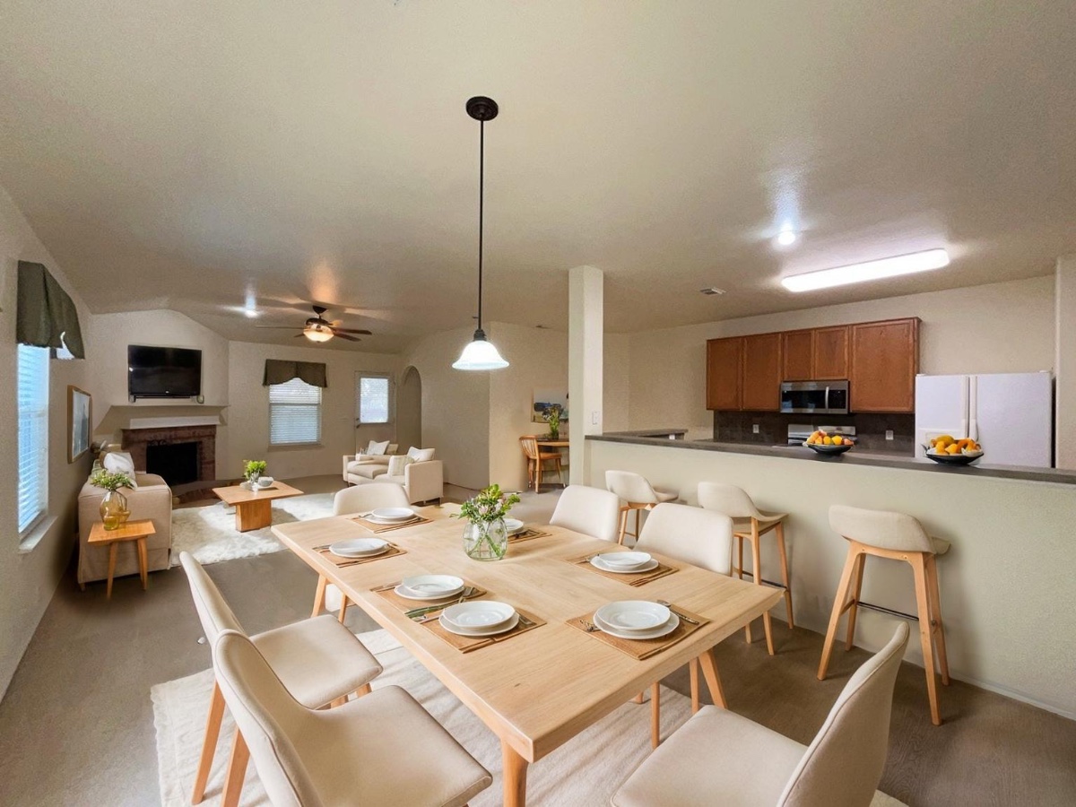 Step into comfort and convenience with this well-appointed 3-bedroom, 2-bath home designed for easy living and entertaining. Featuring an open floor plan with high ceilings, this home offers a seamless flow between the living and dining areas, complete with a cozy fireplace and abundant natural light.
