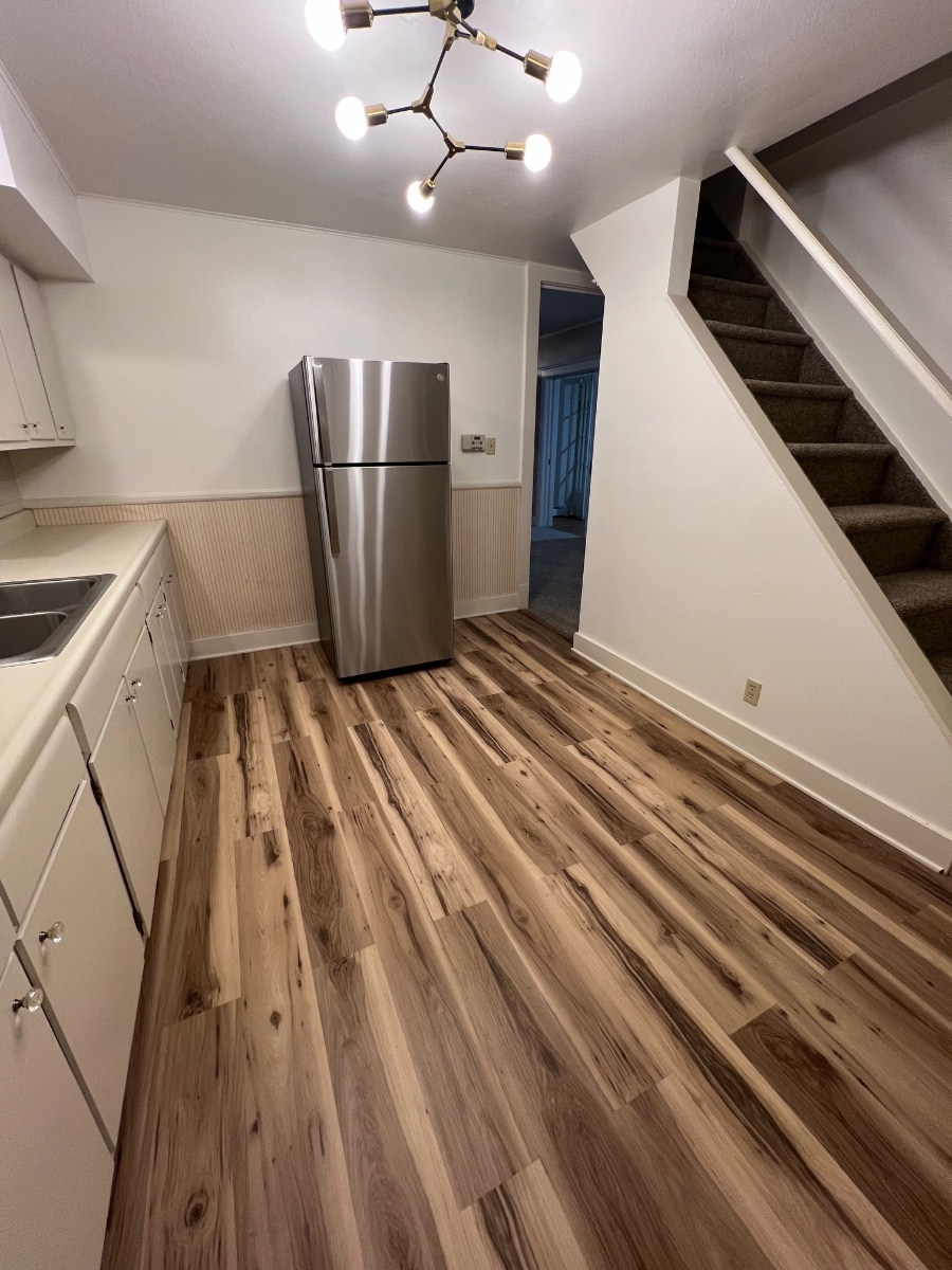 The main level has 2 bedrooms with wood floors, one having a walk-in closet with window and gorgeous large pocket door. The full bathroom on the main level has a clawfoot tub/shower and turn of the century charm. Beautiful new luxury vinyl plank in the eat-in kitchen (as well as brand new stainless steal refrigerator.) The main family room boasts a fireplace to make a nice addition for cozy winter nights. A sunroom off the main room provides nice additional space for sun-catching, relaxing, studying or entertaining a guest. All new light fixtures in entire house with new ceiling fans in all bedrooms. New Trex deck for front porch!