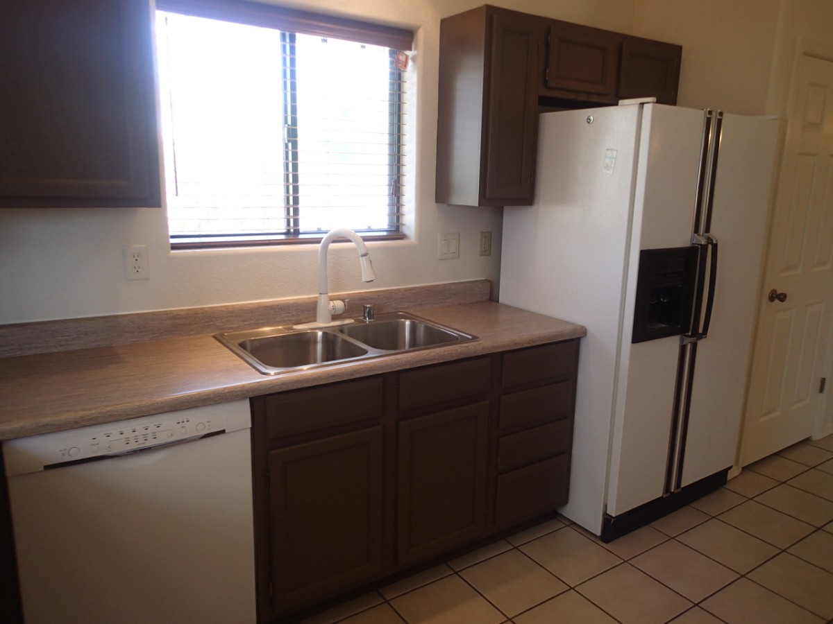 Very pleasant and welcoming house with wood laminate and tile floors, wood burning fireplace in living room draws the attention when entering, separate dining room behind the kitchen with an electric stove, dishwasher, garbage disposal, microwave above stove, two pantry closets, 3 bedrooms, 2 baths, family bath has shower/tub combination, ceiling fans in all bedrooms, living room and dining room, nice size closets, master bedroom has a walk in closet, master bath has a separate walk in shower, central a/c, wood blinds throughout, 2 car garage, patio in backyard, block wall fence in backyard, desert landscaping. Ready for occupancy, come see and move in. Pets are handled on a case-by-case basis.