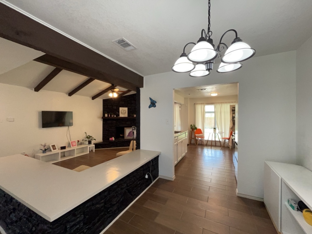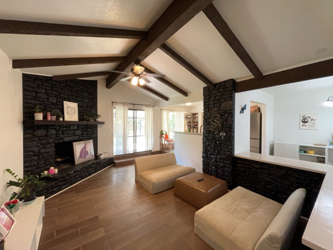 The living area features a cozy fireplace and ceiling fan, creating a perfect spot to unwind. The kitchen is equipped with solid countertops, a pantry, electric stove, microwave and refrigerator ideal for those who enjoy cooking and entertaining. A separate laundry area in the garage comes with a washer and dryer for added convenience.