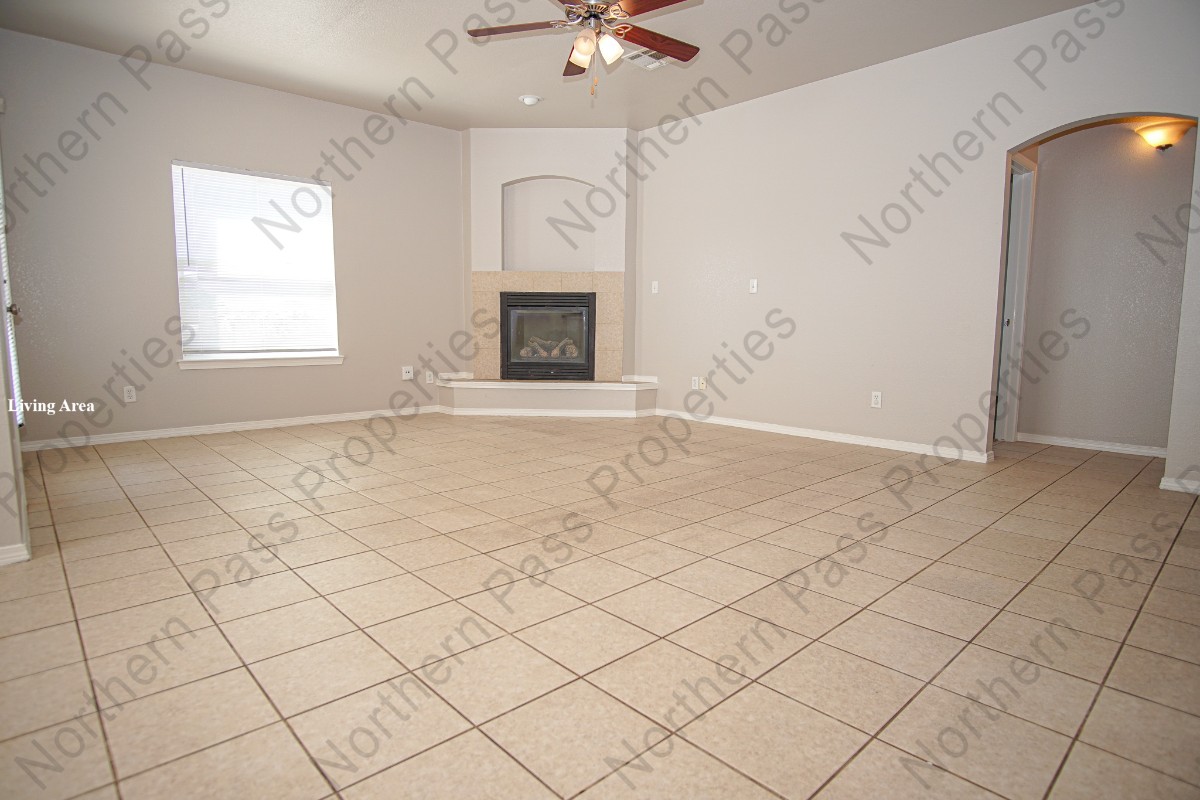This spacious 3-bedroom home is located in the Mesquite Hills area in Northeast El Paso not far from shopping, schools and Fort Bliss. This home has a great little courtyard right off the entrance of the home. Walk into a nice size entry way with a coat closet. To the right you will find a hallway that has 2 great size guest bedrooms, both with ceiling fans, carpet, and good size closets. Also, there is a full-size guest bathroom down this hallway. Straight off the entry way you have a large living area with tile flooring, ceiling fan and a beautiful fireplace. This spacious living area is also open to your dining area and kitchen which is perfect for entertaining. The kitchen is a great space with plenty of cabinet and counter space, and a great breakfast bar. The kitchen also comes with matching black appliances to include a refrigerator, gas stove, dishwasher, and microwave. Right off the kitchen you will also find your pantry, laundry room, and access to the 2-car garage. The primary bedroom is off of the living room and provides plenty of space. It includes a ceiling fan, carpet, and primary bathroom. The large primary bathroom has dual vanity sinks and a walk-in closet! The backyard in this home is perfect space for entertaining with a covered patio and a nice lawn. It even has a sprinkler system! Did we forget to mention this home was just painted and has REFRIGERATED A/C!!!
