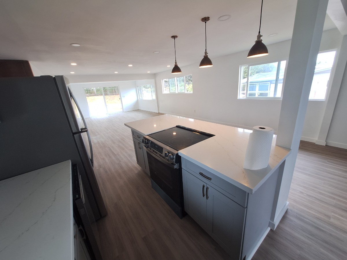Newly renovated with new kitchen, bathrooms, floor, windows, doors. Includes washer, dryer, refrigerator, stove, dishwasher, disposal.