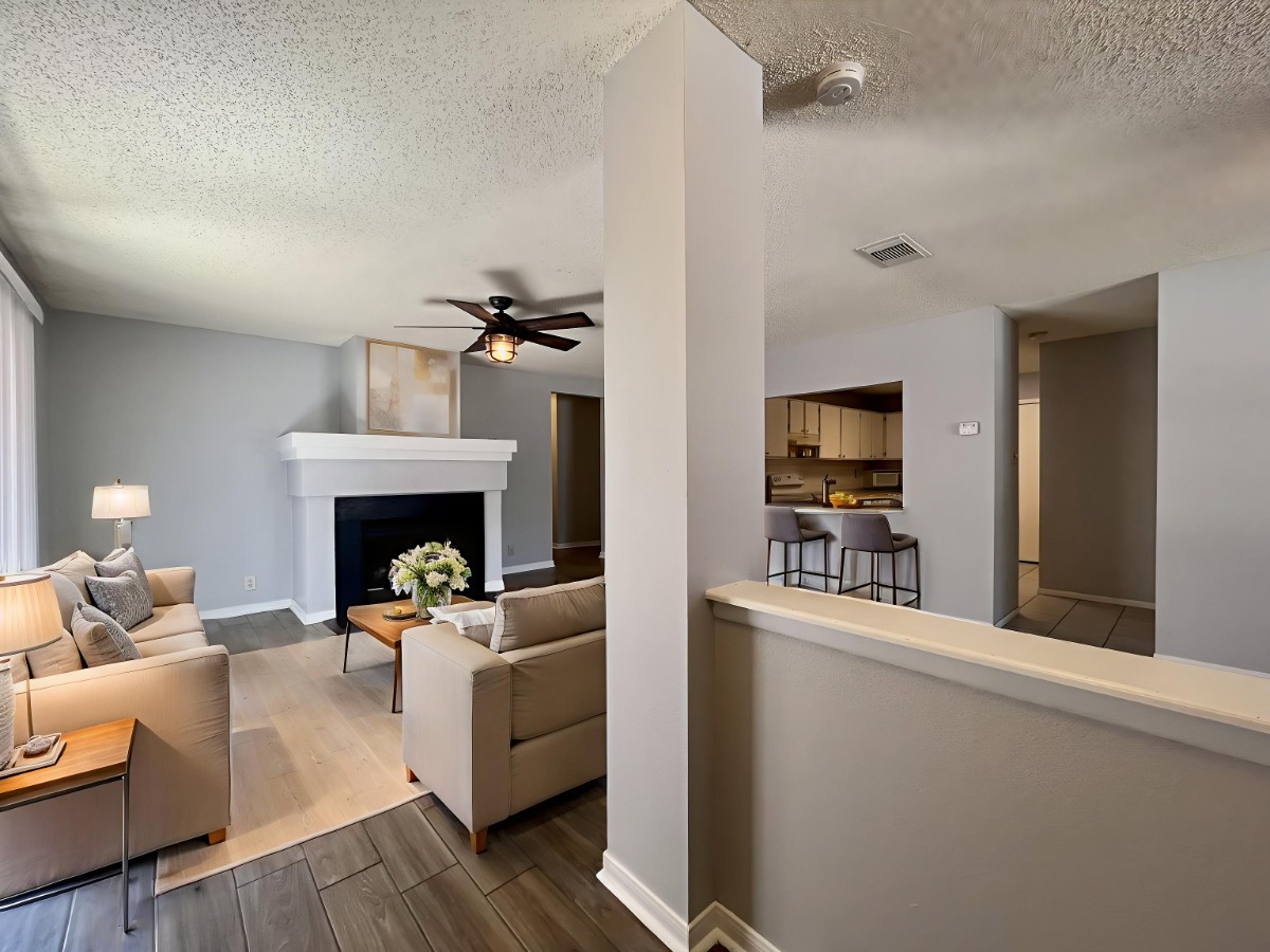 This inviting rental property features 3 well-appointed bedrooms and 2 modern bathrooms, offering a comfortable living experience. Upon entry, you'll immediately notice the stylish ceramic tile flooring that spans the entire home, ensuring easy maintenance and a clean, contemporary aesthetic. The living area boasts a cozy fireplace, creating a warm and inviting atmosphere for relaxation and gatherings. Ceiling fans throughout the property enhance comfort and air circulation.