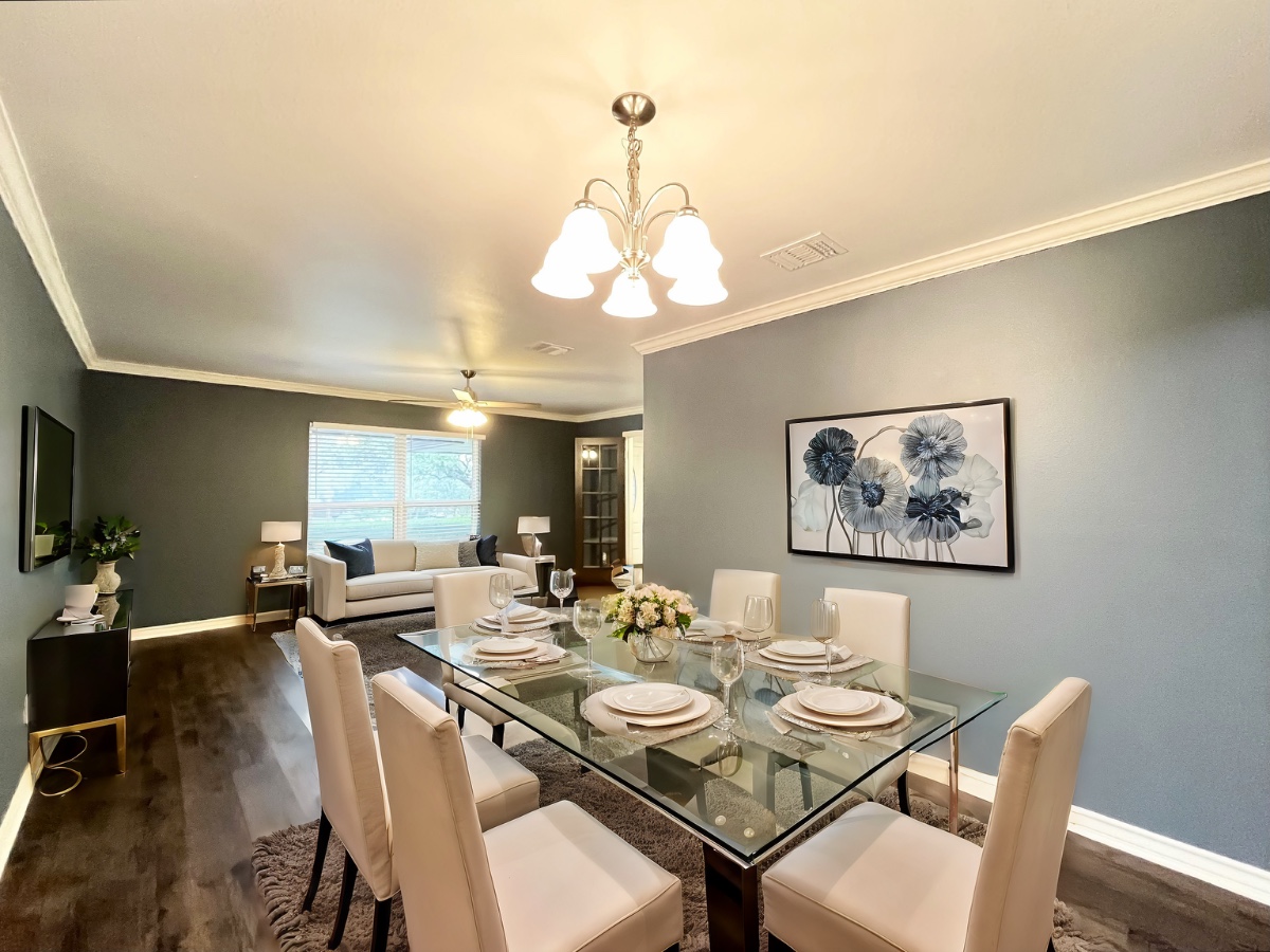This charming 3-bedroom, 2-bathroom home offers modern amenities and a comfortable living space, perfect for those seeking convenience and style. The spacious kitchen is equipped with solid countertops, an island, a breakfast bar, and a full suite of appliances, including a dishwasher, microwave, electric stove with a glass cooktop, refrigerator, and an ice maker connection. A pantry provides ample storage, and the laundry room features both a washer and dryer.