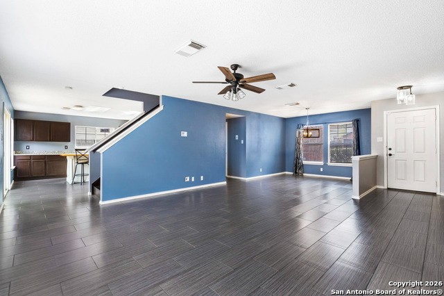 Nestled in a quiet cul-de-sac, this spacious two-story home offers 3 bedrooms and 2.5 baths with a thoughtfully designed layout. Step inside to an open living and dining combo featuring tile flooring throughout the downstairs, creating a bright and welcoming space for everyday living and entertaining. The kitchen boasts abundant cabinet space, stainless steel appliances, a countertop microwave, and a center island with extra seating. A convenient walk-in pantry and laundry room combo, along with a half bath, complete the main level. Upstairs, all three bedrooms are thoughtfully arranged with a game room separating the primary suite from the secondary bedrooms, providing added privacy. The large primary bedroom features a decorative accent wall, ceiling fan, walk-in closet, and a full bath with double vanity and a tub/shower combo. Step outside to the patio deck overlooking a fenced backyard with mature trees-perfect for relaxing or entertaining. Residents can also enjoy community amenities including a playground, pavilion, and BBQ area. Ideally located with easy access to Loop 1604 and Braun Road, and less than 10 miles from UTSA, Six Flags Fiesta Texas, La Cantera shopping, dining, and entertainment. This home is a must see!