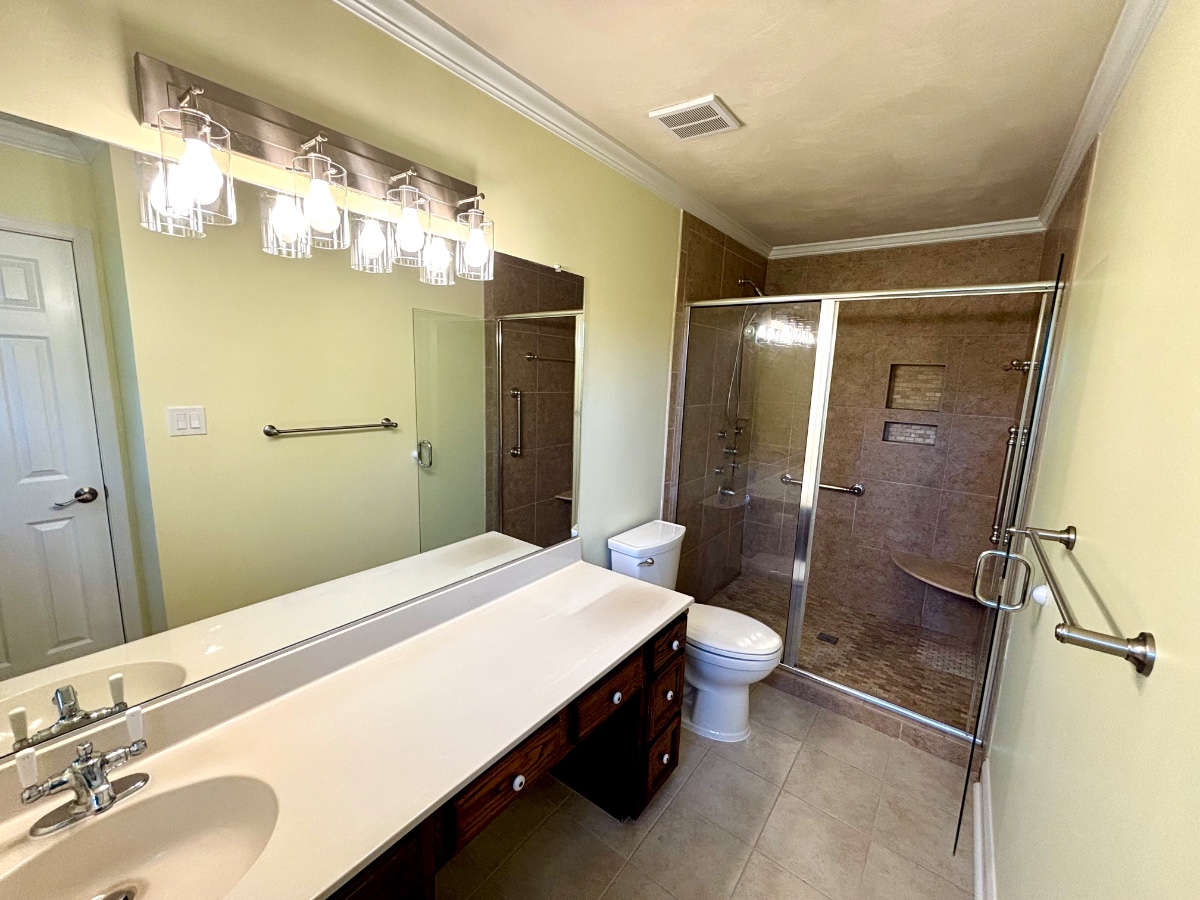 This newly remodeled 3 bed/2.5 bath home features a beautiful backyard with golf course views, a bright living room with soaring ceilings and skylights, a spacious kitchen with bar seating, two walk-in closets, and plenty more to offer. A second living room affords you the opportunity to have a home office, library, playroom, or whatever you wish!