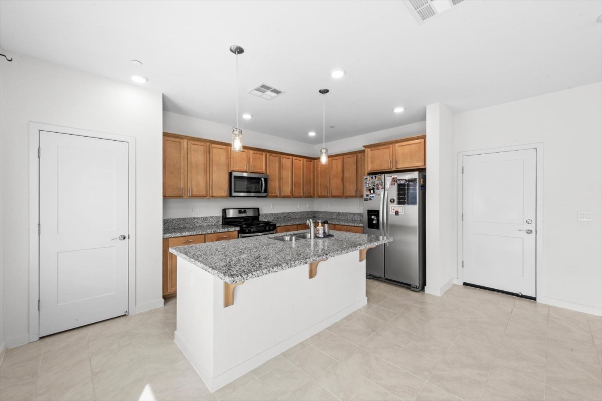 Kitchen has island, pantry, granite counters, and stainless steel appliances.