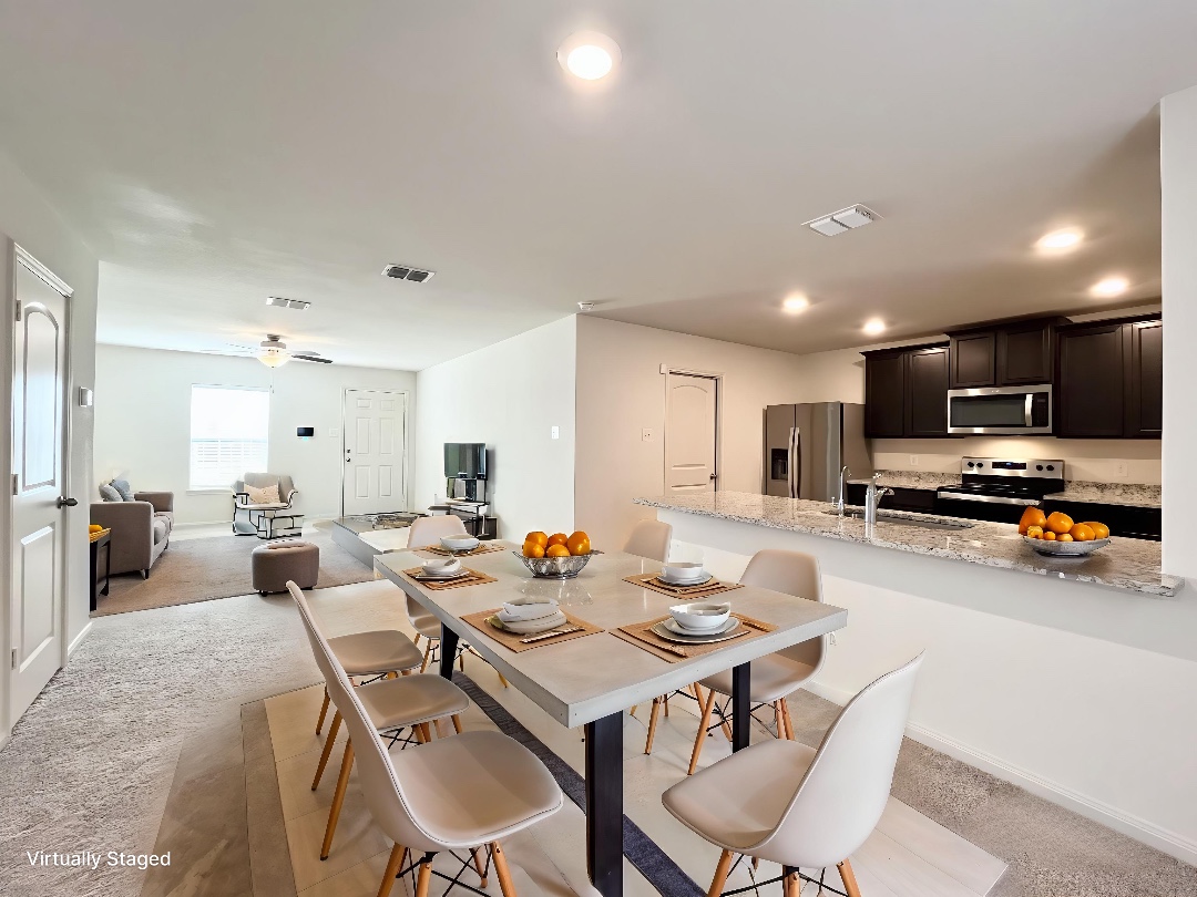 Welcome to a bright, comfortable, and inviting 3-bed, 2.5-bath home designed for easy living and effortless hosting. Step inside to an open floor plan that blends the living and dining areas, creating a spacious setting for relaxing, entertaining, or simply enjoying your day. Soft carpet and durable vinyl flooring add warmth and practicality throughout, while an alarm system, low-energy efficient windows, water softener, and a programmable-thermostat HVAC offer convenience and peace of mind.