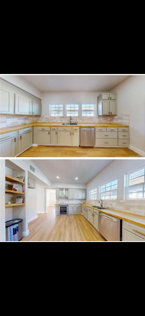 Huge laundry room with sink and large open pantry for convenience. Modern stainless steel appliances: refrigerator, dishwasher, washer, and dryer.