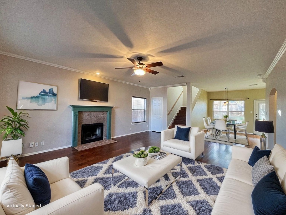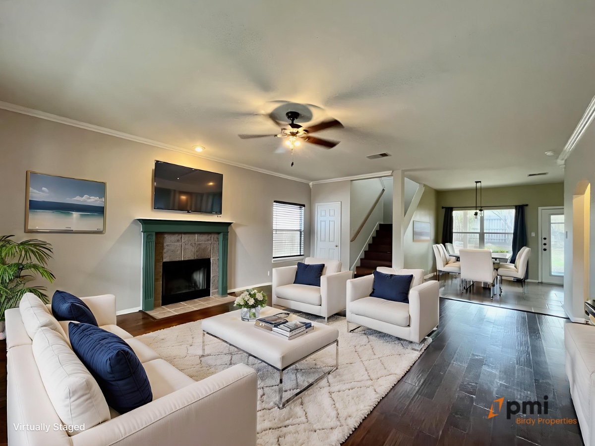 As you enter, the inviting living room boasts a wood-burning fireplace, providing a cozy and warm ambiance for gatherings and relaxation. The eat-in kitchen offers a dedicated space for meals and entertaining. The kitchen is well-equipped with essential appliances, including a dishwasher, stove/range, and a microwave, ensuring convenience in meal preparation and everyday living.