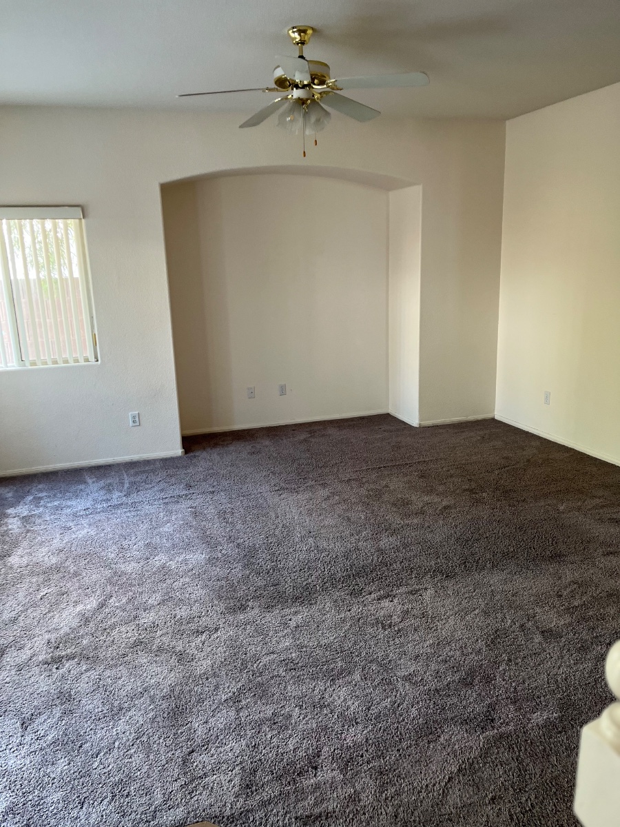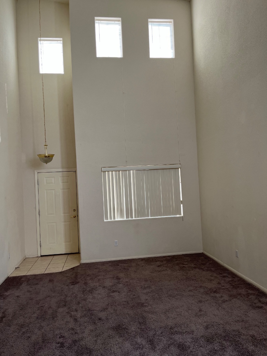 2 Story House with Cathedral Ceilings, has split staircase that accesses the living room / kitchen family room area,, 3 Bedroom House, Master Bedroom is extra large and includes space that could have been a 4th Bedroom. Has 21/2 bathrooms. Master Bedroom shower has been recently retiled and new shower door. Has large family room, has ceiling fans in all bedrooms plus family room, 2 Car Garage and is landscaped. Refrigerator, washer & gas dryer. Nice house! Gated Community. Walking distance to elementary school. Has large patio area off family room and naturally shaded in afternoon. Large gated yard. Has natural gas hook-up for barbecue.. Have had previous Military Tenants including a Colonel (4 years), Master Sergeant, Chief Navy Corpsman. . Distance to Nellis AFB according to Mapquest is 11 miles. Front yard is red rock .