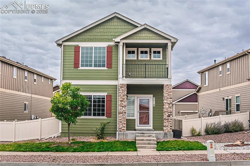 Welcome home to this beautiful two-story home nestled in the desirable Forest Meadows neighborhood. This charming residence boasts three bedrooms, three bathrooms, and a dedicated office, all complemented by an open concept floor plan flooded with natural light and beautiful site-finished hardwood floors on the main level. The stunning kitchen is perfect for entertaining, featuring quartz countertops, shaker-style cabinetry, and stainless steel appliances, including a gas range. Step outside from the dining area to your private, fully fenced yard with a sprinkler system. Upstairs, the impressive master suite features vaulted ceilings, a large walk-in closet, and a private covered patio deck—ideal for enjoying a sunset or morning coffee. Additional highlights include a two-car attached garage, central air conditioning, and a huge unfinished basement ready for your personal touch. Its location is exceptionally convenient, situated within a short 20-minute drive to both Fort Carson and Peterson Space Force Base, and mere minutes from the vibrant Powers Corridor, offering easy access to a vast array of shopping, dining, and entertainment options, as well as parks, schools, and medical facilities.
