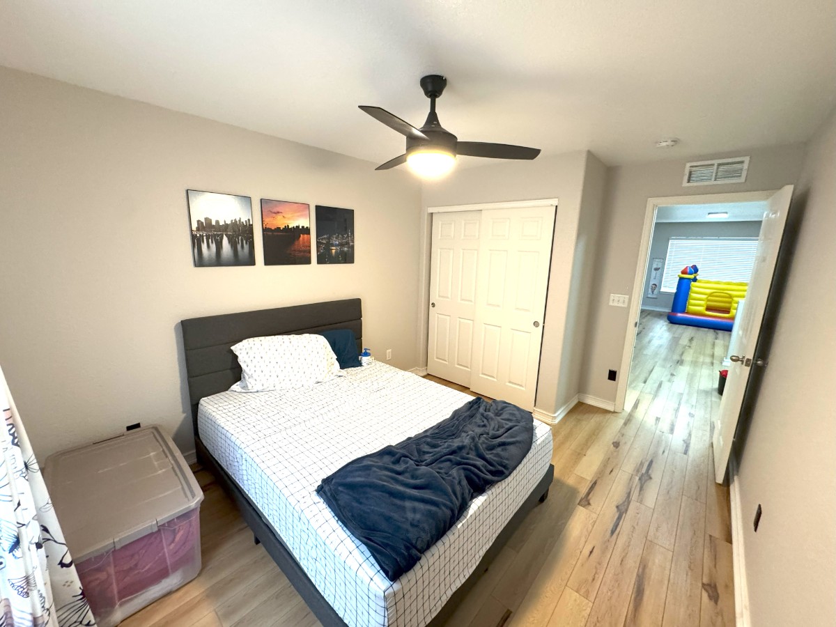 Upstairs, a large open loft area offers flexible space for a family room, home office, or playroom. The primary suite features a spacious bedroom, a walk-in closet, and a private en-suite bathroom with a walk-in shower. Two additional bedrooms and another full bathroom complete the upper level.