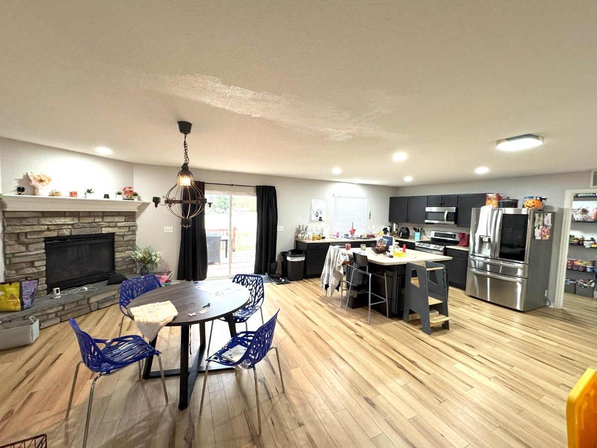 As you enter from the covered front porch, you're greeted by a spacious living area featuring luxury vinyl plank flooring and a cozy gas fireplace — perfect for relaxing or entertaining. The living room flows seamlessly into the dining area and modern kitchen, which boasts granite countertops, stainless steel appliances (including a stove, refrigerator, dishwasher, and microwave), abundant cabinetry, and a generous walk-in pantry.